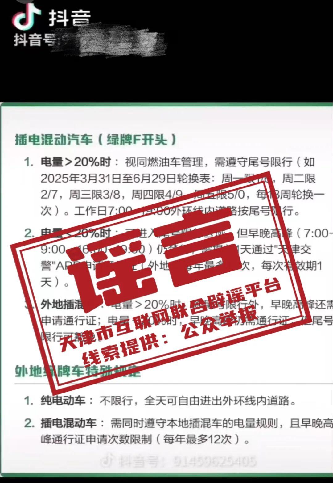 近日,网传“天津市新能源小客车限行政策调整”相关内容,称“天津市对插电式绿牌新能源车辆实施限行”。经向市公安交管部门核实,相关内容均为不实信息,按照2025年3月21日天津市公安局发布的《关于继续实施机动车限行交通管理措施的通告》,新能源小客车(以车辆登记信息为准)不受机动车尾号及外埠、区域号牌小客车高峰限行措施限制。