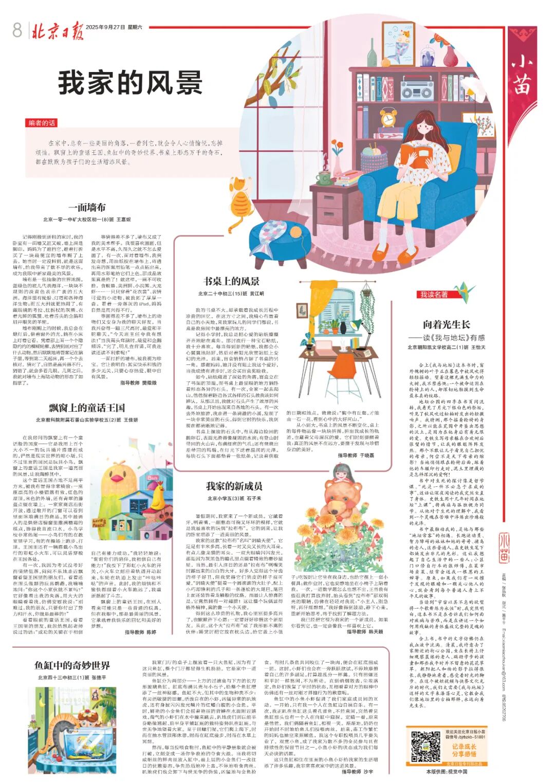 《小苗》版是《北京日报》上一个专属于孩子们的创作天地!在这里,孩子们可以书写自己成长的故事,展开想象的翅膀,也可以对城市建设提出建议。每周,《小苗》都会在《北京日报》与孩子们准时见面。在这里,孩子们可以看到自己一点点长大的足迹。