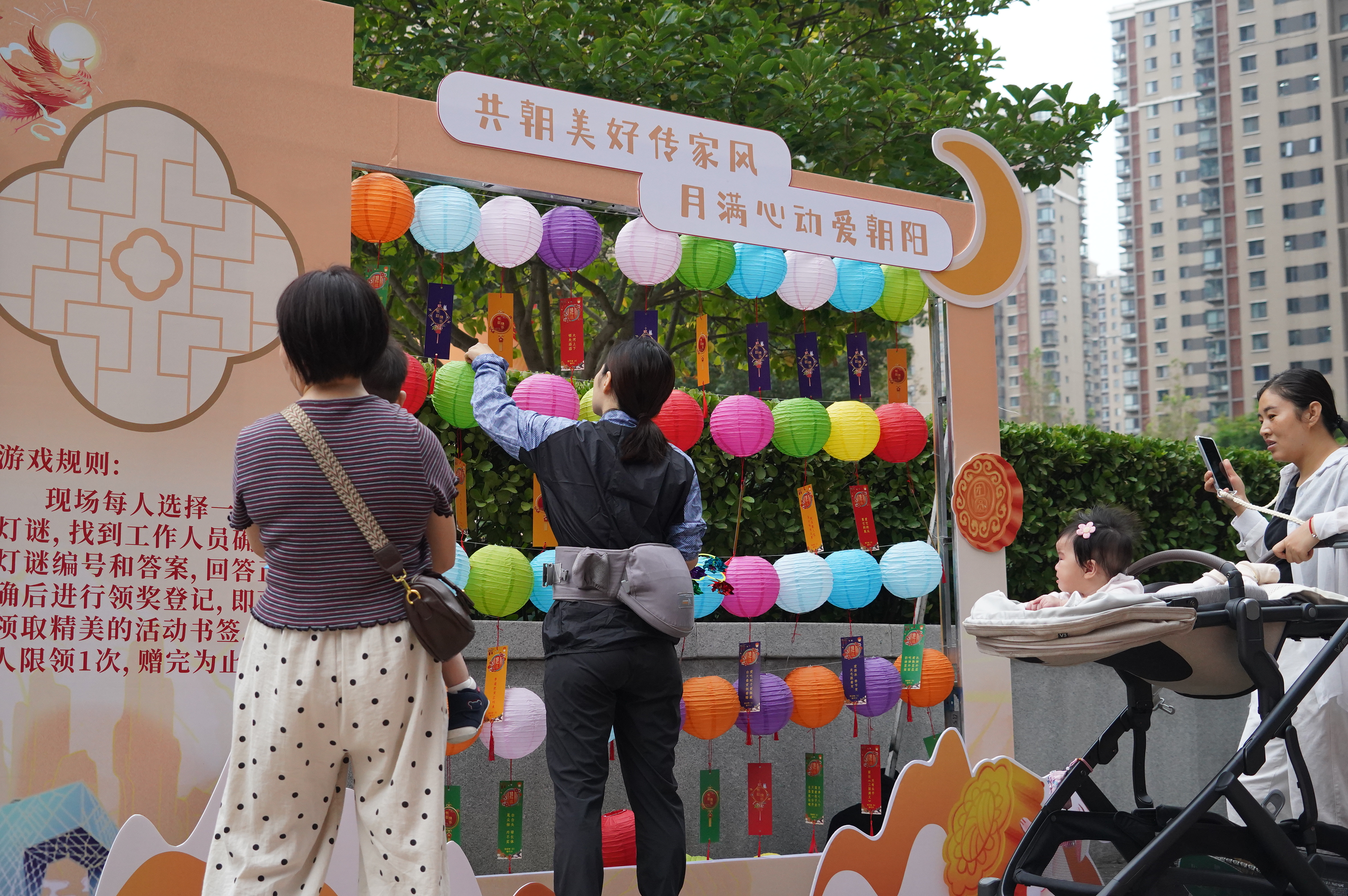 除了启动仪式,同步开展的“朝阳美家 月满心动”家庭市集设置了6个免费民俗体验摊位,3D 打印笔创作、中秋手提灯笼 DIY、家风书法漆扇绘制、猜灯谜、传统投壶等活动,让居民们在动手实践中感受传统文化魅力,体验节日乐趣。