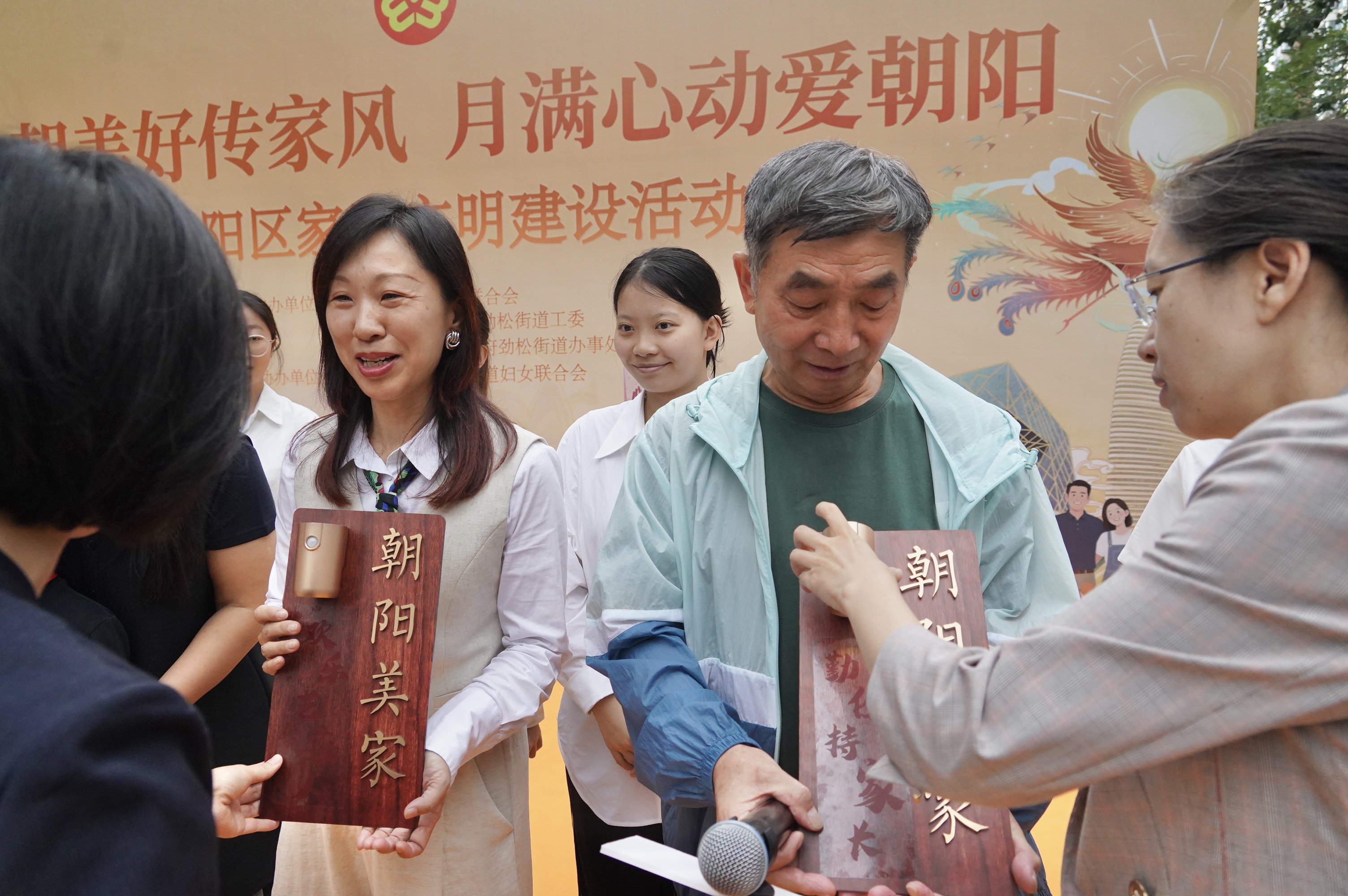 家庭代表分享家风故事环节中,边丰杰、耿妍、李童雁三组家庭代表先后上台,分享了各自的家风传承故事。在“家风传承”篇章中,去年获得“美家”门牌的苏春香家庭作为特邀嘉宾,为边丰杰、耿妍、李童雁、武永超、宋心源、周佳璐的家庭代表授予“朝阳美家”门牌。