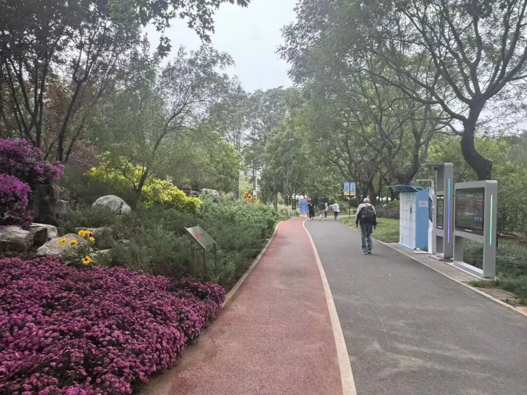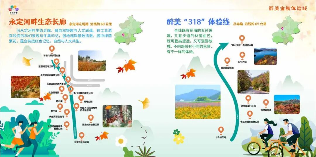 在全市范围内还甄选了30条斑斓似锦的画廊点位。在车公庄大街,金黄的银杏、粉红的蔷薇为繁忙的都市注入自然活力。大兴永定河左堤路两侧,银杏、白蜡为道路披上彩色盛装,被誉为“北京十大最美乡村路”之一。西山绿道石景山段,与海淀、门头沟绿道串联成京西“山水绿链”,黄栌、五角枫更把山野染成五彩画卷,尽显金秋韵味。