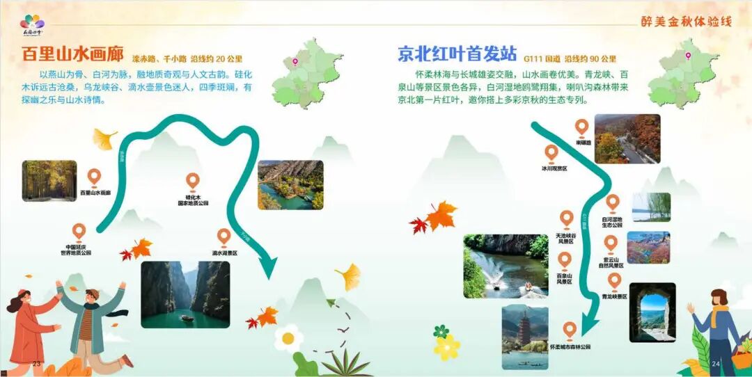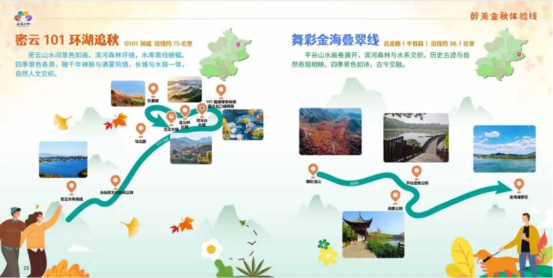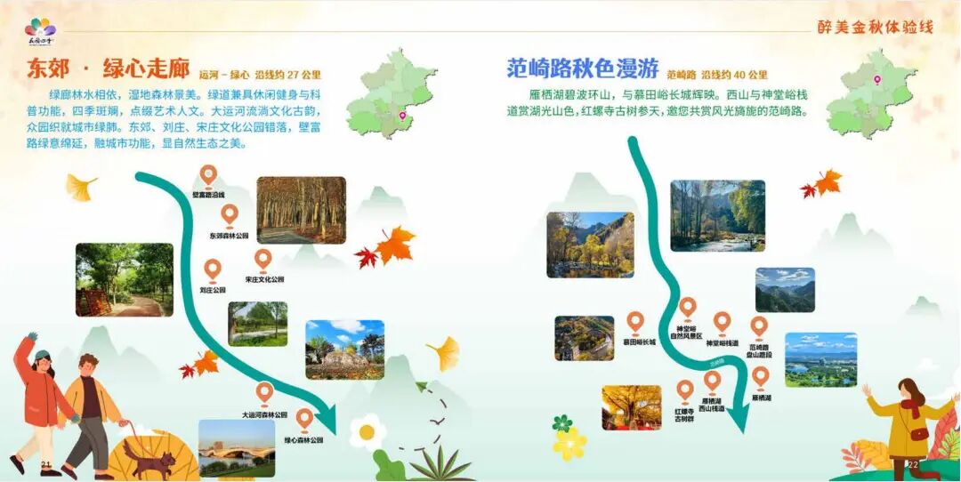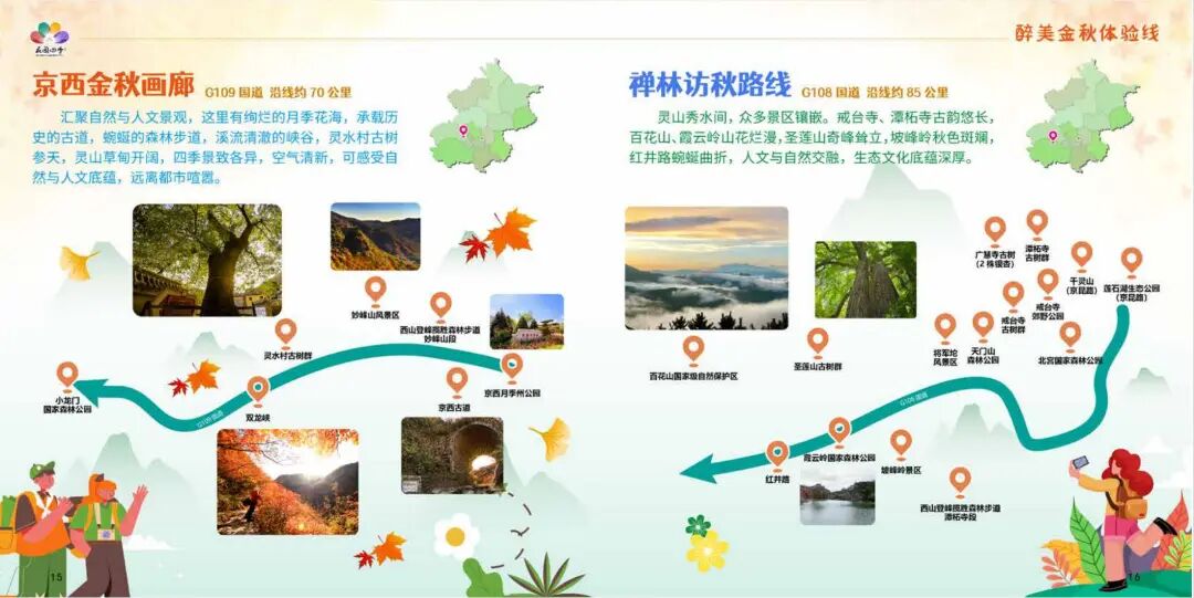 同时,全市还择优推荐20处秋芳遍野的彩叶森林。门头沟妙峰山的“金顶彩林”景致将秋日色彩拉满,房山坡峰岭的“黄栌盛景”更是不容错过。此外,用网红交通线路串起经典赏秋点位,向市民推荐12条“醉美金秋体验线”。密云101环湖追秋线,沿101国道一路向北,邂逅古北水镇的古镇秋韵。范崎路秋色漫游线,还有奥北金秋走廊、百里山水画廊、永定河畔生态长廊,每条路线都有专属的秋日记忆。