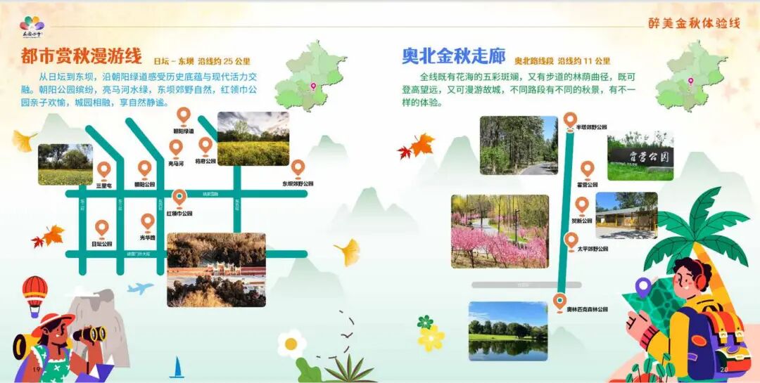 朝阳区园林绿化局副局长李大鹏介绍,今年秋天,朝阳区构建了“15条精品金秋路、54处多彩公园”的打卡布局,为市民打造秋日的“限定展厅”和流动的“户外画廊”,最佳赏秋时间在10月中旬到11月初。