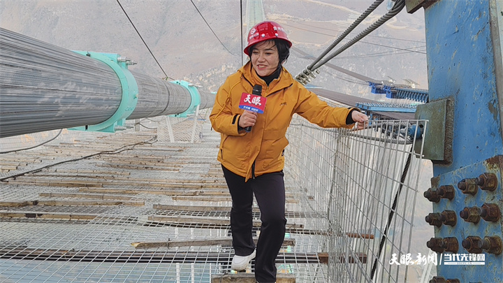 花江峡谷大桥荷载试验直播现场,邓果正在接受记者采访。