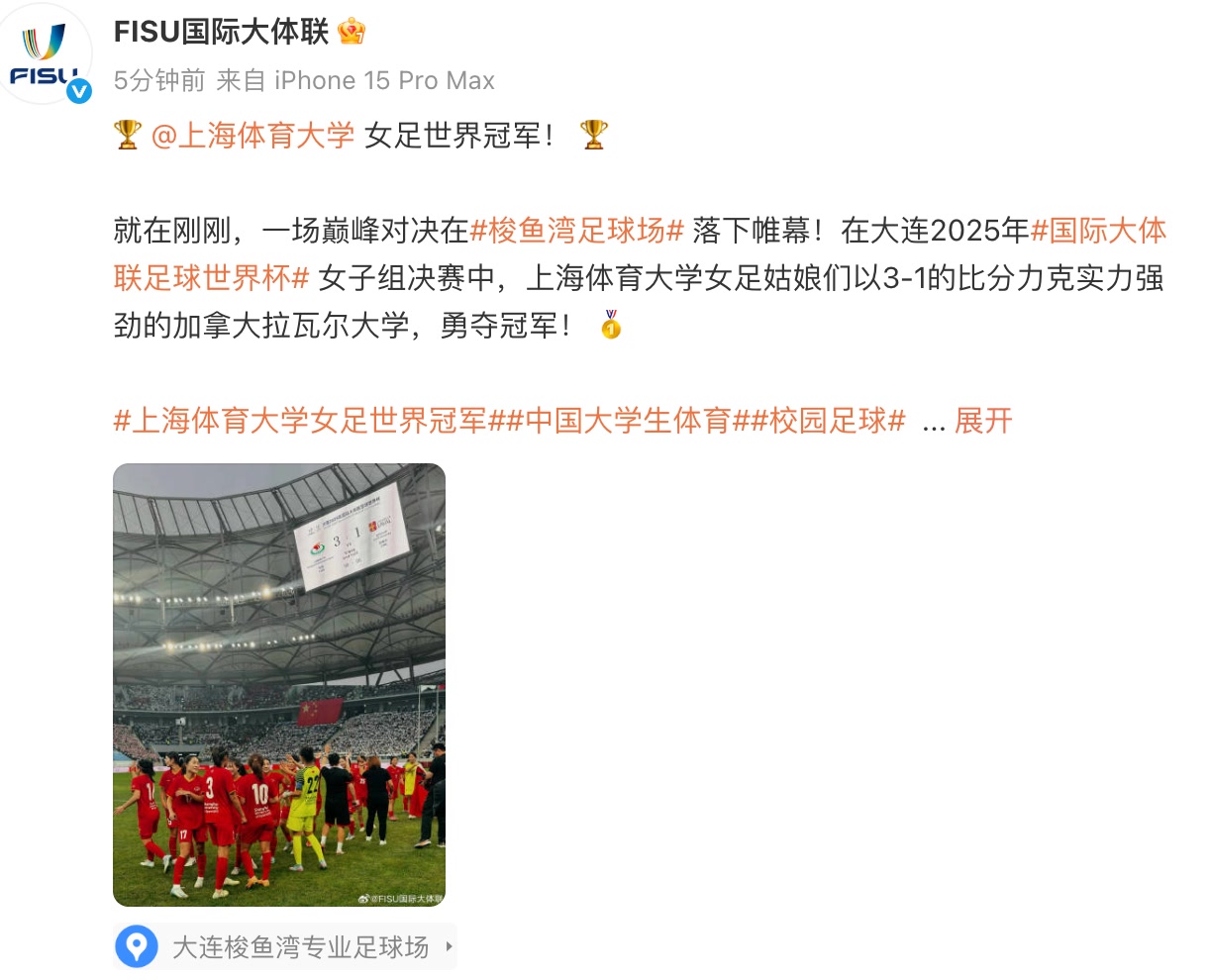 国际大体联消息,9月27日,在大连进行的2025年国际大体联足球世界杯女子组决赛中,中国上海体育大学女足力克实力强劲的加拿大拉瓦尔大学队,勇夺冠军。