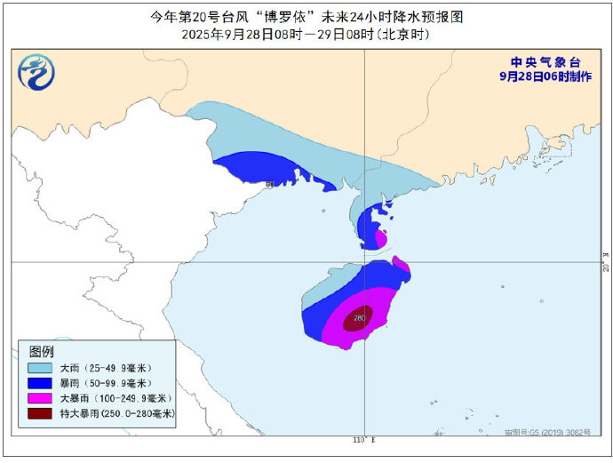 降水预报:28日08时至29日08时,广西南部、广东西南部、海南岛等地部分地区有大到暴雨,其中,海南岛中南部等地部分地区有大暴雨,海南岛东南部局地有特大暴雨(250-280毫米)。