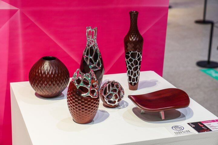 青年学子还在创作中积极探索“艺术+科技”的融合路径。滇西应用技术大学运用参数化设计与CNC技术(计算机数控技术)打造的锡制花器《木韵镶清》,云南民族大学结合3D打印与花丝技艺创作的首饰《云丝鹤影》,表现了数字化工艺与传统手作的创新对话。