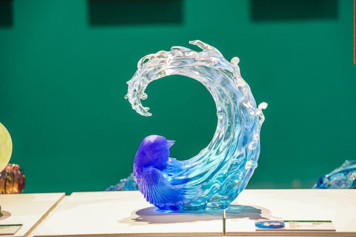 展览现场,一件件融合东方美学与当代语境的工艺作品,吸引众多观众细细欣赏、拍照留念。山东工艺美术学院学生以两万根扎带编织而成的纤维艺术作品《石杼·游影》,将太湖石的天然形态转化为几何与曲线的对话;福州大学厦门工艺美术学院的玻璃作品《精卫》,以深蓝色磨砂质感再现神话意象,传递坚韧不息的精神力量;中央美术学院的首饰作品《繁与简》则通过线条的解构与重组,实现东西方美学的巧妙融合。