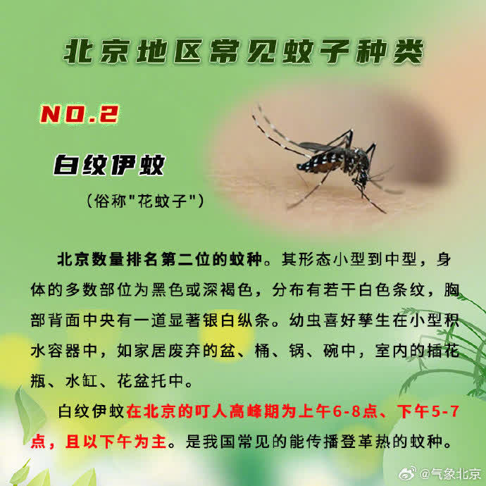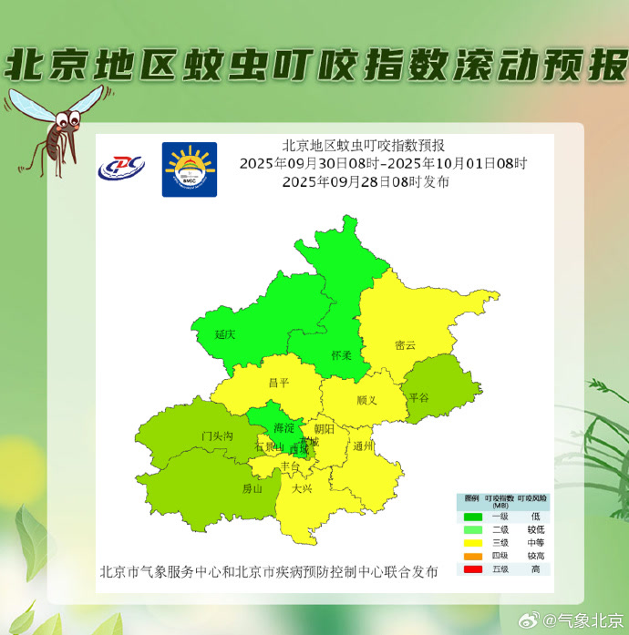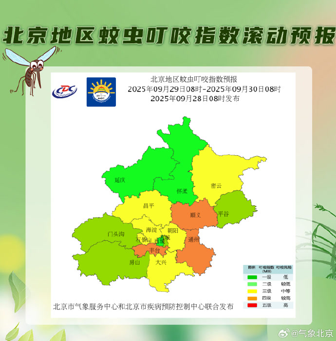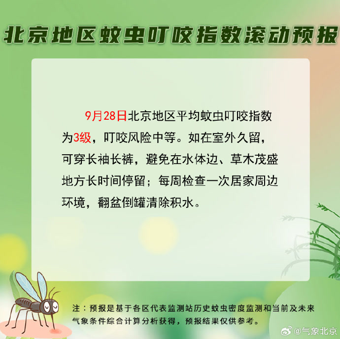 9月28日北京地区平均蚊虫叮咬指数为3级,叮咬风险中等。如在室外久留,可穿长袖长裤,避免在水体边、草木茂盛地方长时间停留;每周检查一次居家周边环境,翻盆倒罐清除积水。