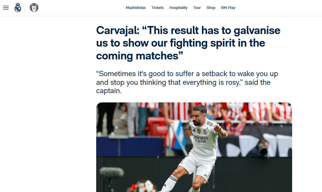 遭遇执教“银河战舰”首败,今夏成为皇马主帅的阿隆索说:“我们踢了一场糟糕的比赛,开局不好,团队配合、进攻质量、无球跑动也都不好……所以遭遇了赛季的第一场失利。”他表示,球队还在建队阶段,前进的脚步不会停。队长卡瓦哈尔也表示,在赛季初连胜后遭遇这样一场失利对球队并非坏事,“这场失利会激励我们在接下来的比赛中找回战斗精神。”