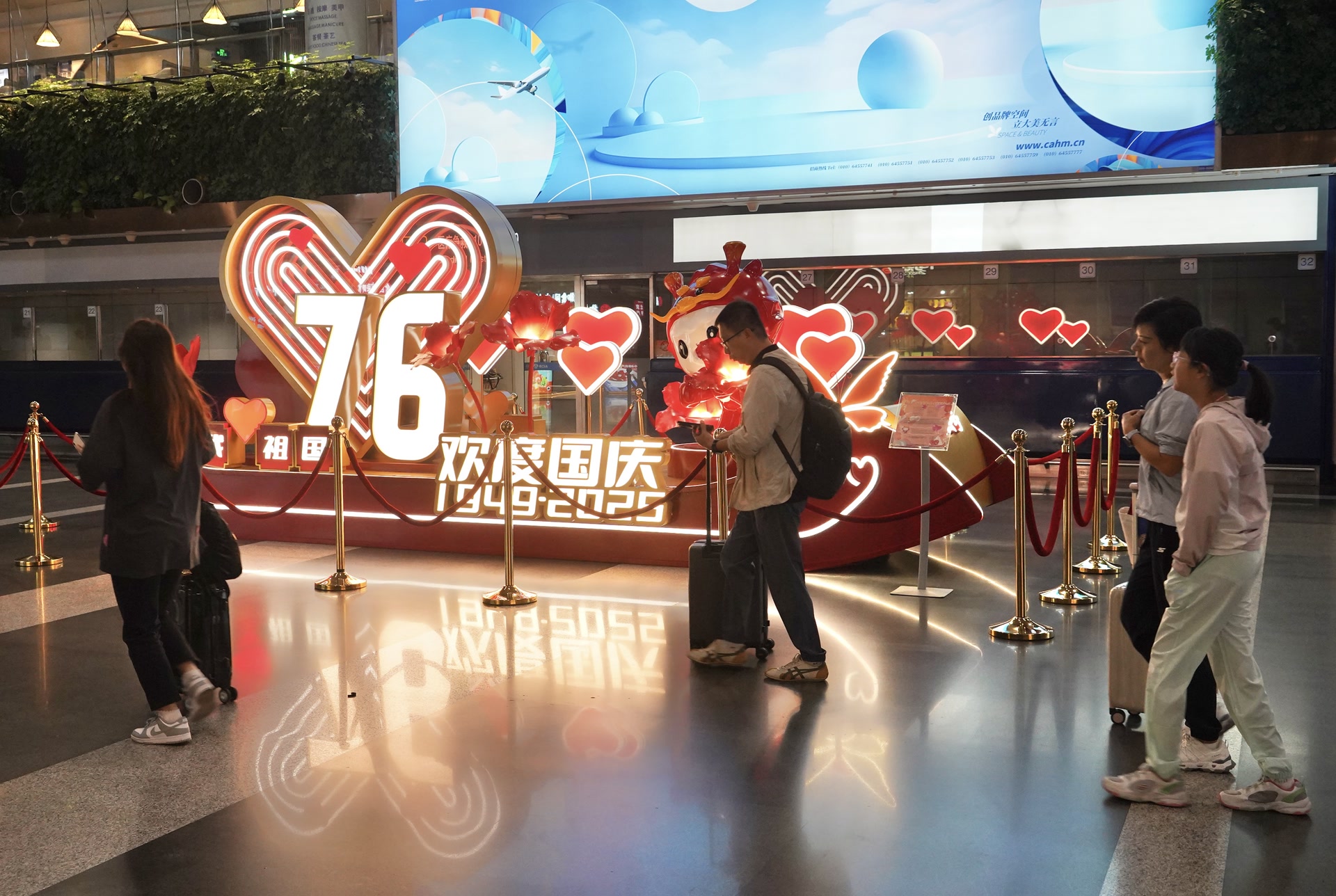 今天上午,记者来到首都机场2号航站楼看到,机场出发层精心打造的“红舟载爱”主题节日景观已经亮起了灯,景观以船为造型,象征着祖国发展如航船破浪般前行。