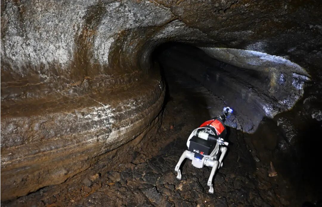 下到洞穴内部,可见其高约3米,宽4至5米,部分区段骤然收窄,人员难以通行。此时,由北大计算机学院研发的机器狗成为关键“侦察兵”,稳健地执行人类无法轻易完成的测绘任务。