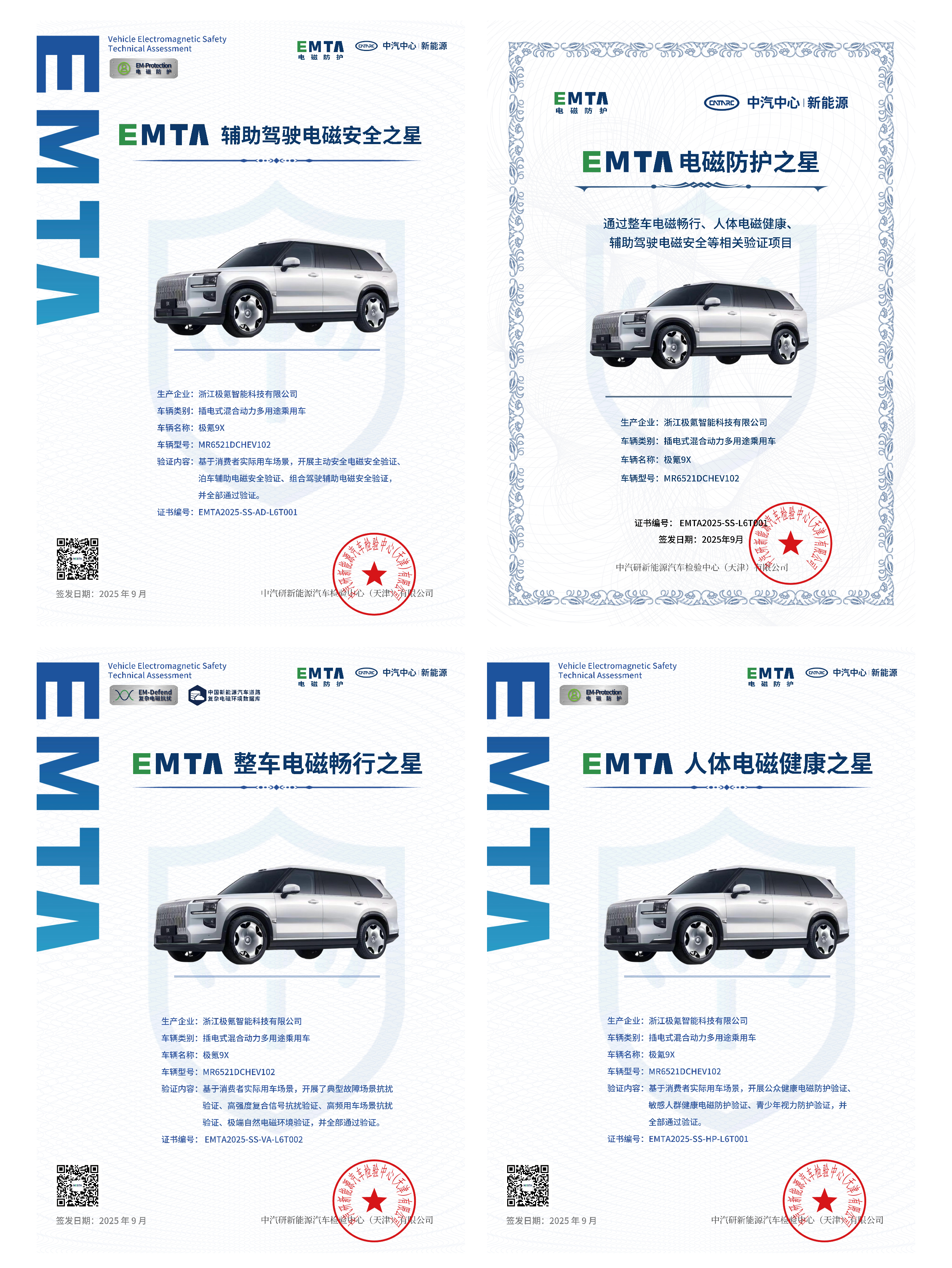 近日,极氪9X凭借行业领先的电磁安全能力,成为首批通过电磁防护验证全部测试的车型,被中汽中心授予“EMTA电磁防护之星”。