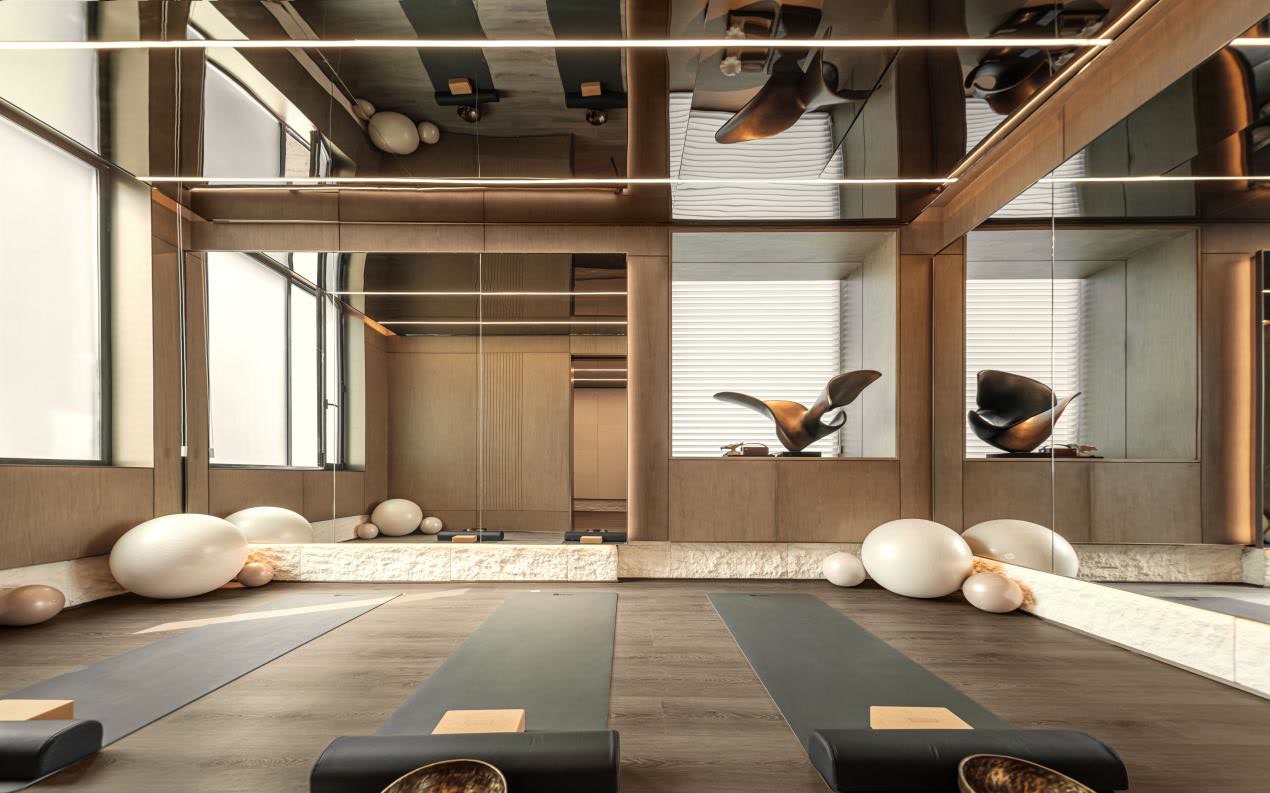 雨天时,业主经风雨连廊,无需撑伞即可直达架空层健身房或亲子空间;烈日下,连廊沿途的休息座椅成为观赏园林的理想点位,抬头可见静心水庭的“玉叶冰心”雕塑,低头能赏乌克兰海洋蓝钻奢石的水面,自然与休闲场景无缝衔接。