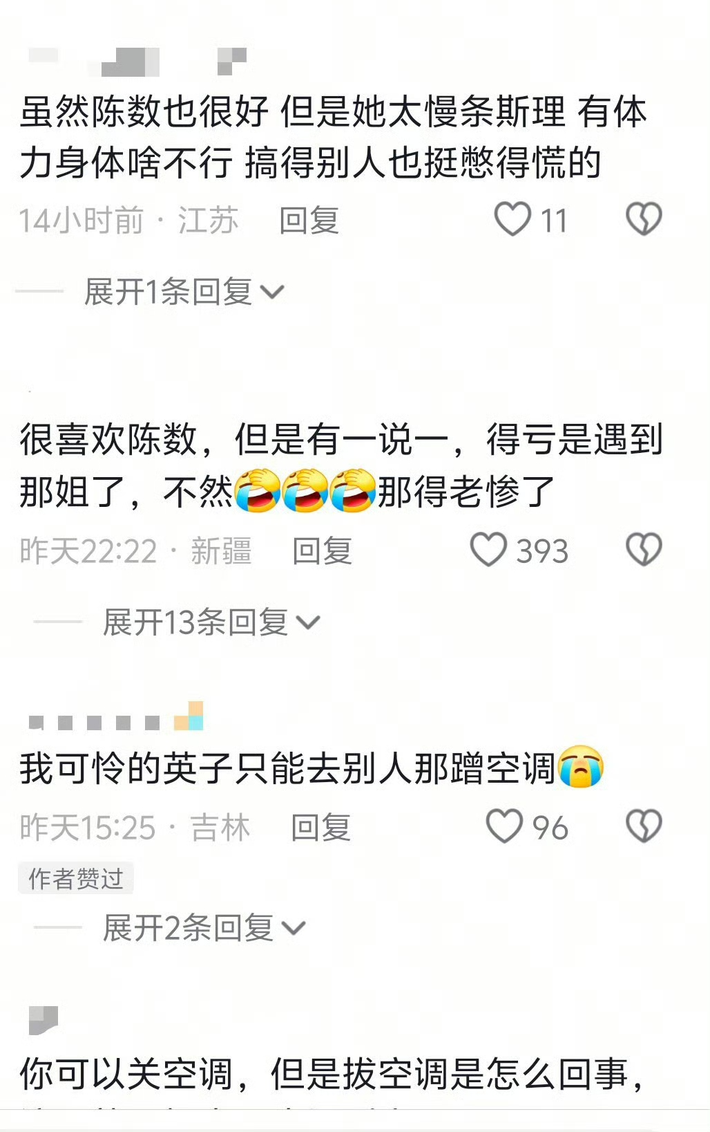 此外,作为团队中年龄较长的成员,陈数的体能明显跟不上节奏。在需要体力的活动中,她常常落在队伍后面,甚至被部分观众贴上“拖油瓶”的标签。