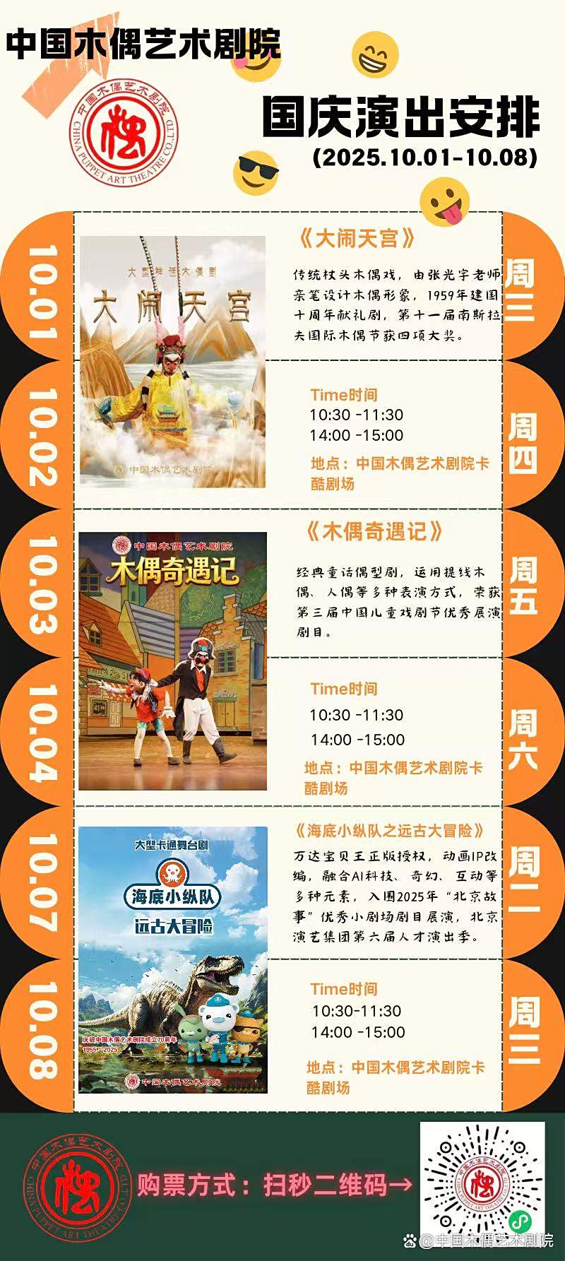 国庆八天:“票根畅享”活动:凭任意舞台剧票根、脱口秀票根、演唱会票根、电影票根、景区票根及木偶剧院周边餐饮消费小票,即可在中国木偶艺术剧院售票处享受木偶剧演出8.5折优惠。