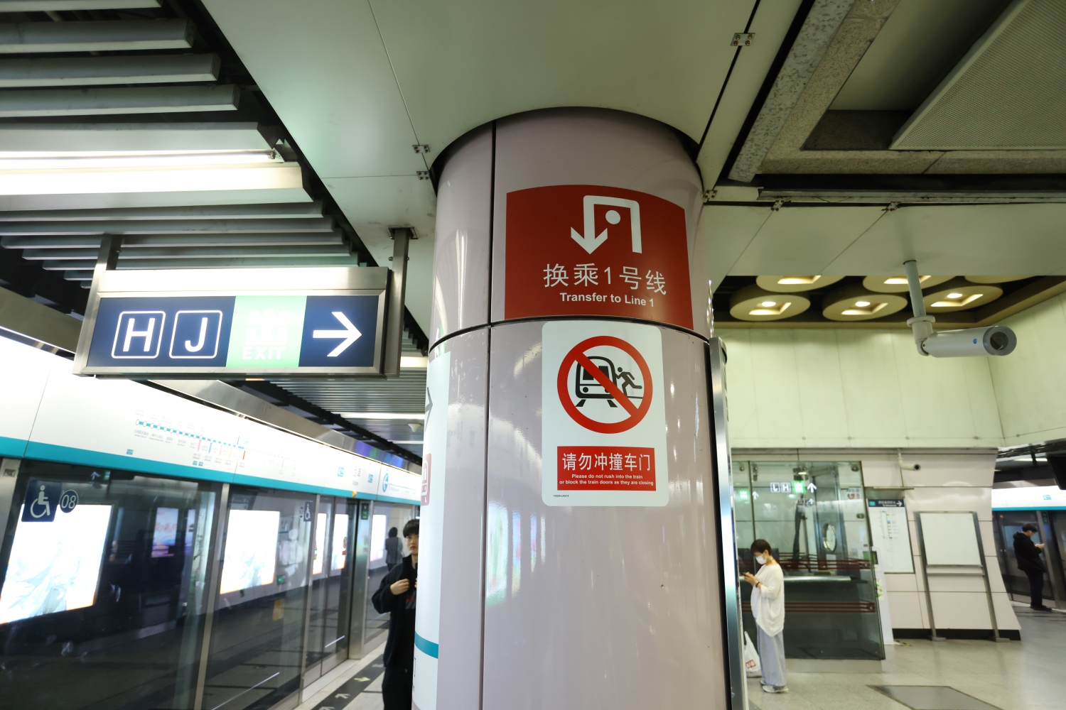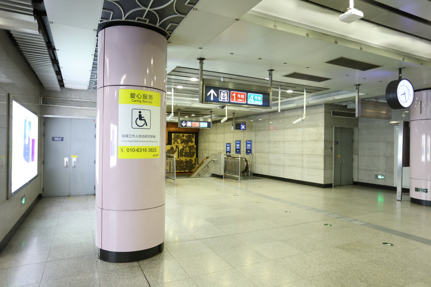 4号线西单站作为与1号线的换乘站,换乘客流较大。此次升级重点强化换乘路径指引,在站台、站厅、换乘通道等关键位置,通过灯箱、墙贴等组合式标志,清晰指引前往1号线的方向。此外,在西单站站台门上方新增“下一站”信息提示,便于乘客快速确认列车运行方向,减少误乘情况的发生;在站台门张贴列车时刻表二维码,方便乘客随时查询列车信息,合理安排出行。