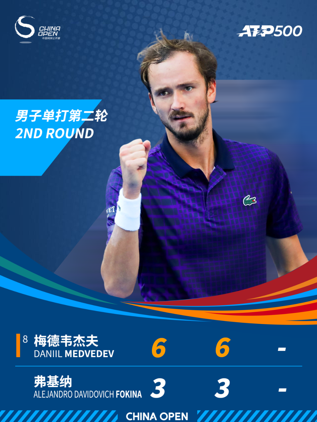 男单方面,梅德韦杰夫直落两盘击败弗基纳,勒纳·钱、兹维列夫等也晋级八强。
