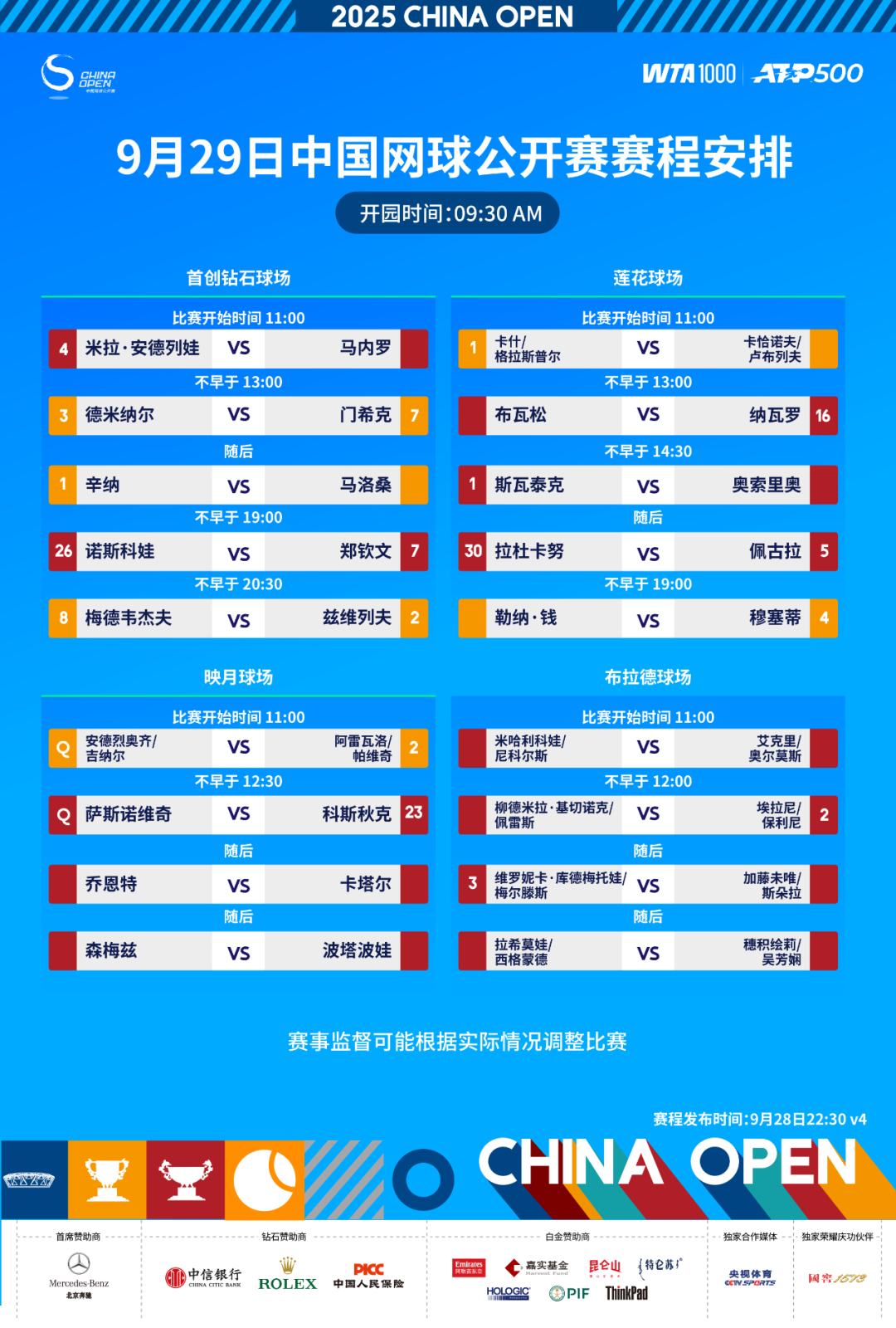 9月29日,郑钦文将在首创钻石球场晚场比赛中登场,对阵淘汰了王曦雨的诺斯科娃。此外,拉杜卡努和佩古拉的对决引人关注,安德列娃、斯瓦泰克等也分别为16强席位而战。
