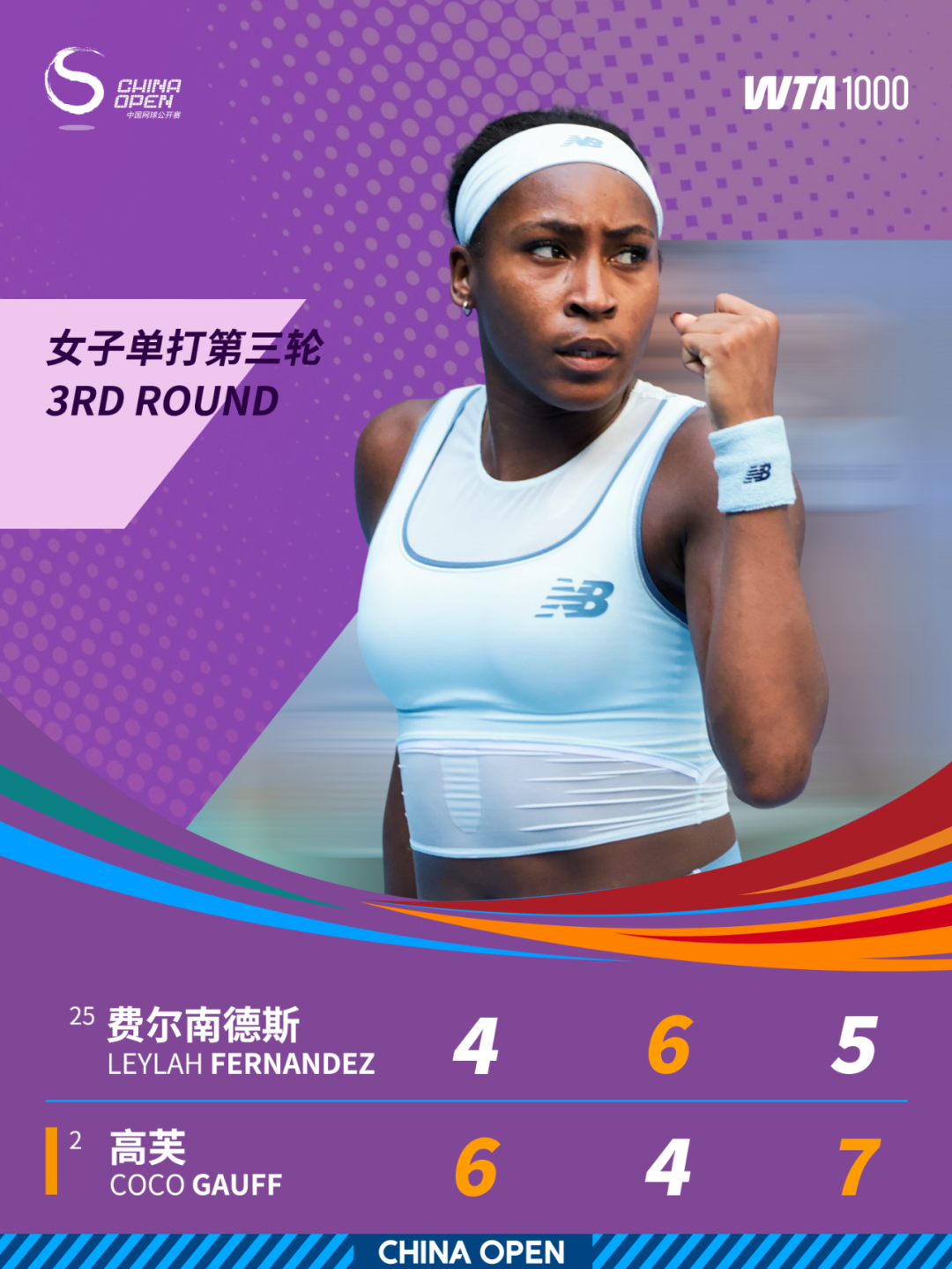 9月28日,高芙击败费尔南德斯晋级,保利尼、穆霍娃、本西奇等也都淘汰对手锁定16强席位。中国金花张帅不敌3号种子阿尼西莫娃无缘更进一步。