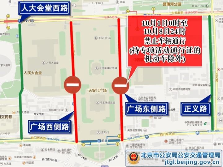 2025年10月1日至10月8日,对北京部分道路采取交通管理措施。2025年10月1日0时至10月8日24时,天安门广场东侧路、天安门广场西侧路采取禁止车辆通行的临时交通管理措施,过往车辆可绕行周边道路。详情>>