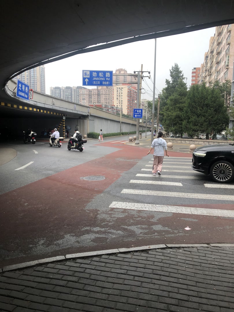9月25日,记者来到广渠门桥下,对比照片和视频,大部分画面都锁定在了广渠门桥的东北角。正值早高峰,汽车、自行车、电动自行车、三轮车如潮水一般从东边的广渠门外大街涌到了桥下,再与桥下正在盘桥转弯的车辆“拧”成一股更大的车流。为了顾及正在过马路的行人,直行的车辆只能龟速般“蹭”着前行;转弯车辆“挤”在车流中无法回正车身,斜插在路面上挡着车道进退两难;甭管是电动自行车还是普通自行车,想见缝插针从车流中钻过去都困难。不少骑行人着急上班,只好把车骑上了便道;行人发现车道、便道早已没了章法,干脆走到非机动车道上去了……
