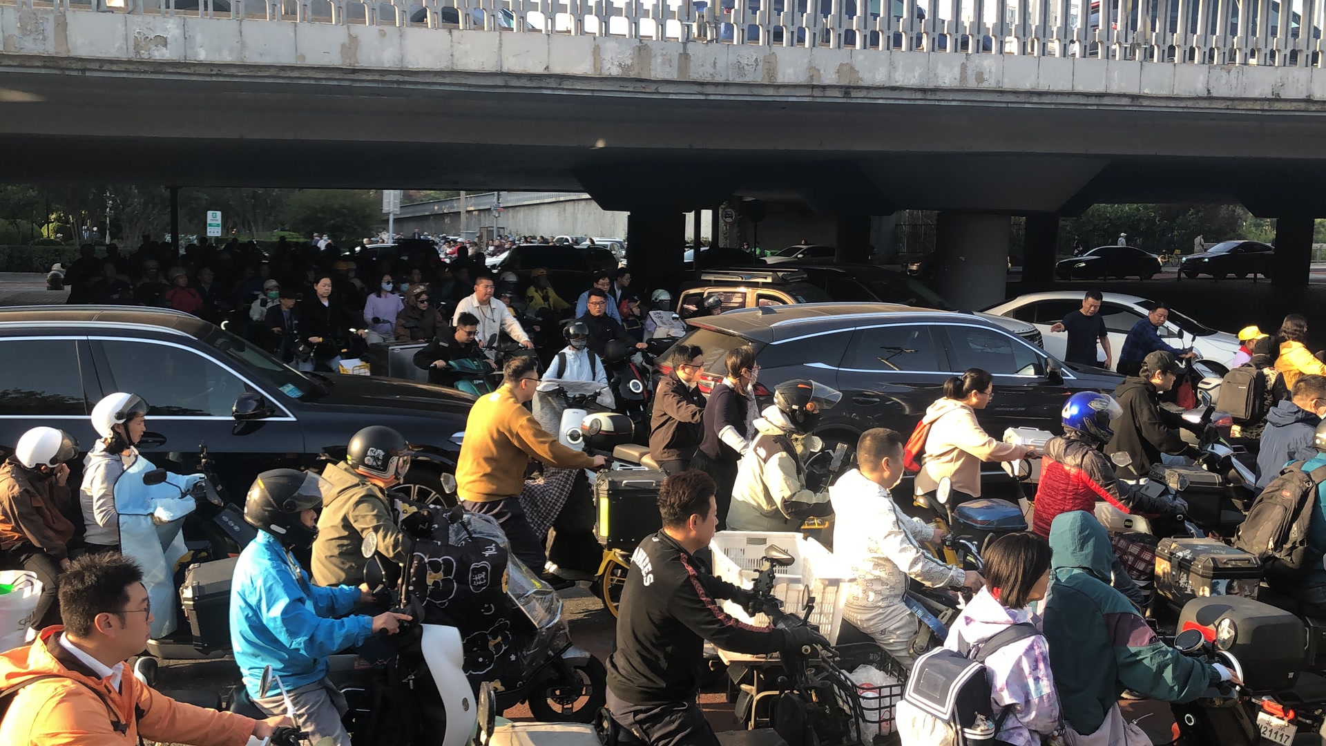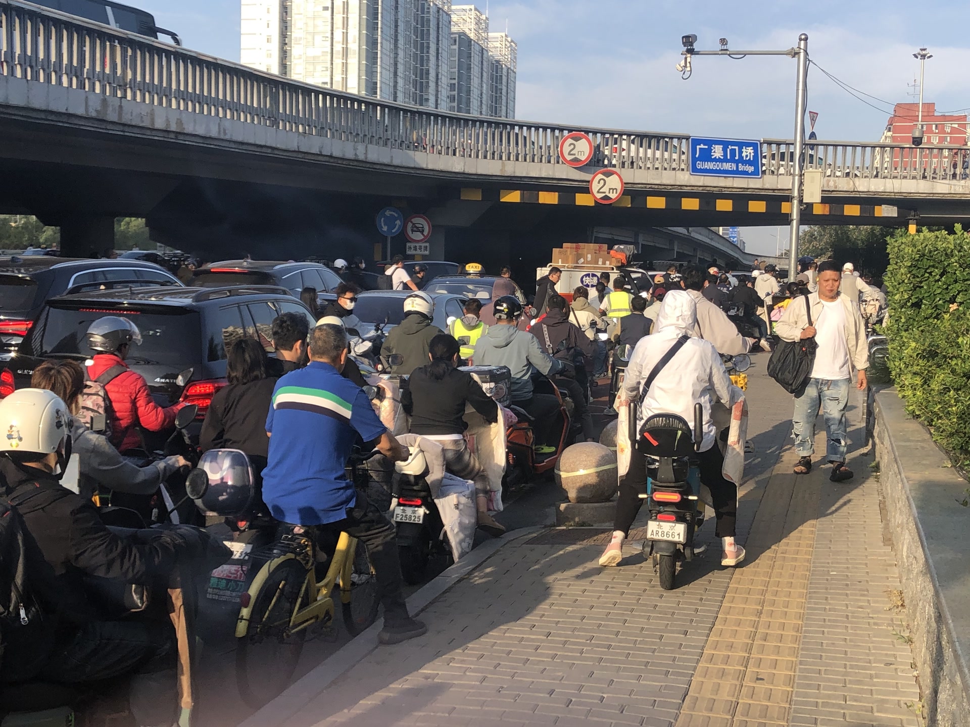 在网络社交平台上,吐槽广渠门桥拥堵的帖子不少,一张张照片、一段段视频中,各种车辆与行人混行的混乱场面引起网友的共鸣。照片上,骑车的人大多皱着眉头;视频里,拍摄者用“推拉摇移”各种手法来表达庞大车流一动不动的无奈;评论区里,不少网友调侃,没想到连骑车都没躲过广渠门桥的拥堵。