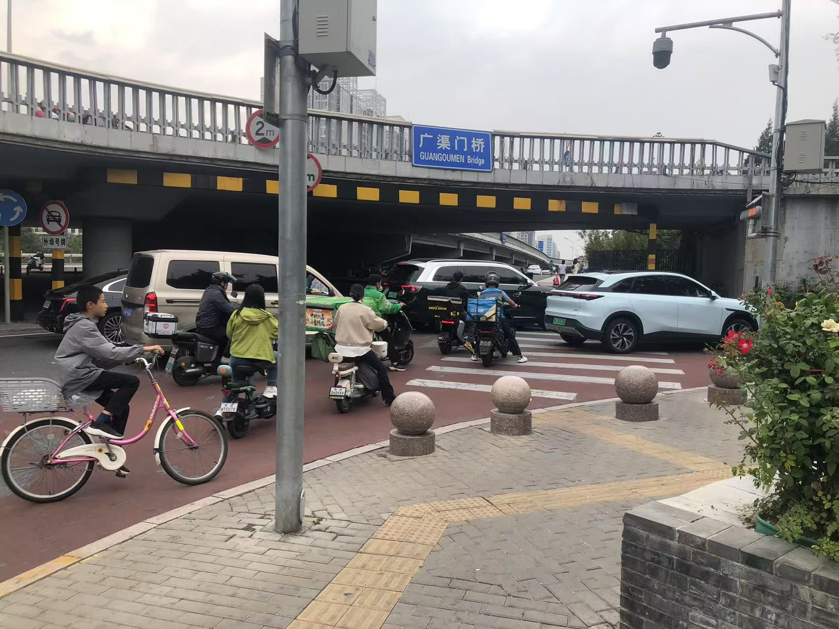 桥下的车少了,问题的实质反倒看得更清楚了。仍以记者反复测试过的路线为例,由东向西骑行至广渠门桥东北角,随后向北进入广渠门北滨河路,短短不足50米长的拐角路段,骑行至少需要4次避让:由东向西骑行过程中,首先要避让斑马线上的人群;再往前蹬几下,就要开始避让桥下盘桥转弯的非机动车;由于道路太窄,实际上还需避让与这些非机动车同向转弯的机动车;过了最难熬的这段路,好不容易向北转弯了,进入广渠门北滨河路前,还有另一段斑马线需要避让。
