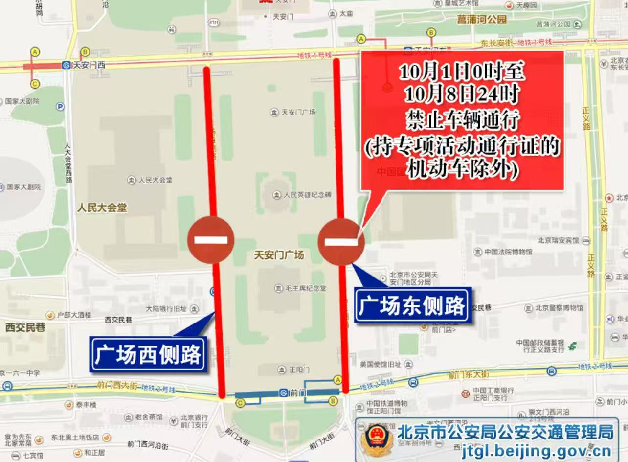 假期期间,天安门地区和香山地区将采取临时交通管理措施:10月1日0时至10月8日24时,天安门广场东侧路、天安门广场西侧路采取禁止车辆通行(持专项活动通行证的机动车除外)的临时交通管理措施,过往车辆(含公共电、汽车)可绕行周边道路。