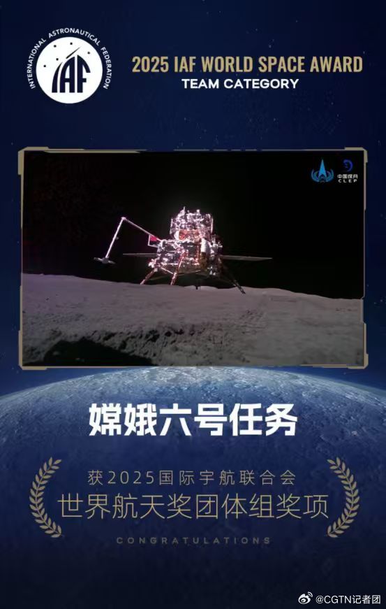 2024年5月3日,嫦娥六号探测器由长征五号遥八运载火箭在中国文昌航天发射场发射升空。6月25日,嫦娥六号返回器携带1935.3克月球背面样品,顺利返回地球,成功完成人类首次月球背面采样壮举。世界航天奖是国际宇航联合会(IAF)设立的航天领域最高奖项,旨在表彰在全球航天科学、技术、工程管理等领域作出重大贡献的个人或团队。