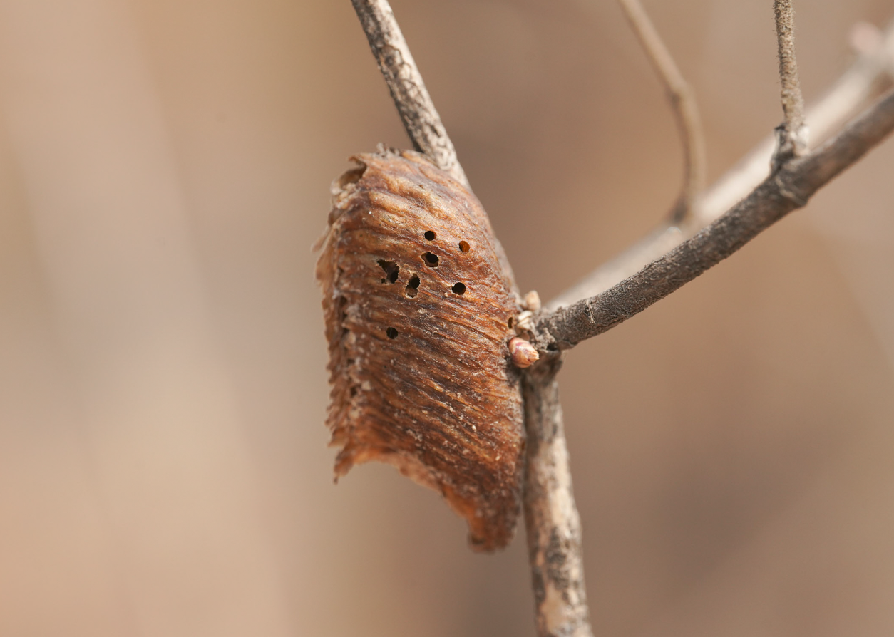 所以,我学乖了。那些看起来又完整又健康的卵鞘,就让它们留在大自然吧,我只挑充满了洞洞的卵鞘捡——这是寄生蜂光顾过的痕迹,一个卵鞘包含着不止一种生命的历程,想想就美妙,收藏起来也很有纪念意义!
