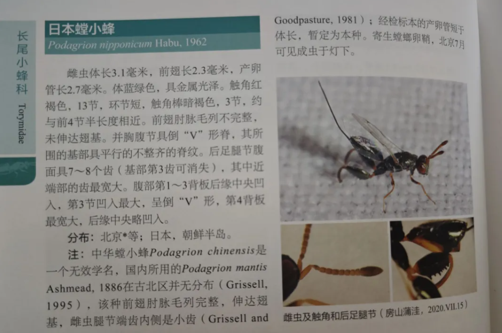 虞国跃老师的《北京林业昆虫图谱IV膜翅目》当中记载了一种日本螳小蜂(Podagrionnipponicum),比对了一下,雌虫的后足腿节小齿像吗?乍一看觉得很像,是不是一毛一样却也不敢说,可能需要一些(我懒得去搞的)认真测量才能下定论。不过雄虫的齿有明显不同。其实,这些齿是干什么用的呢?不太清楚~