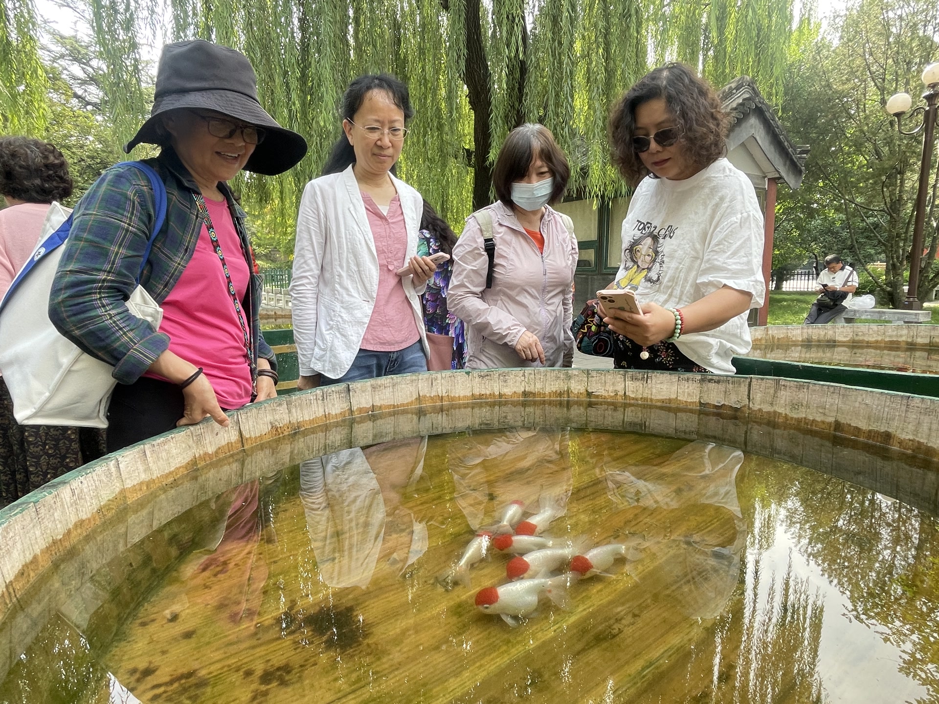 “瞅瞅这大眼睛,跟算盘珠子似的,这尾巴像缎面儿。”在中山公园愉园的一座传统木海旁,养了四十多年金鱼的东城居民胡先生俯下身,和好友仔细端详着水里那尾“黑大眼”。“好的金鱼,体形得匀称,颜色得鲜亮,游起来那姿态,得有劲儿又优雅。”
