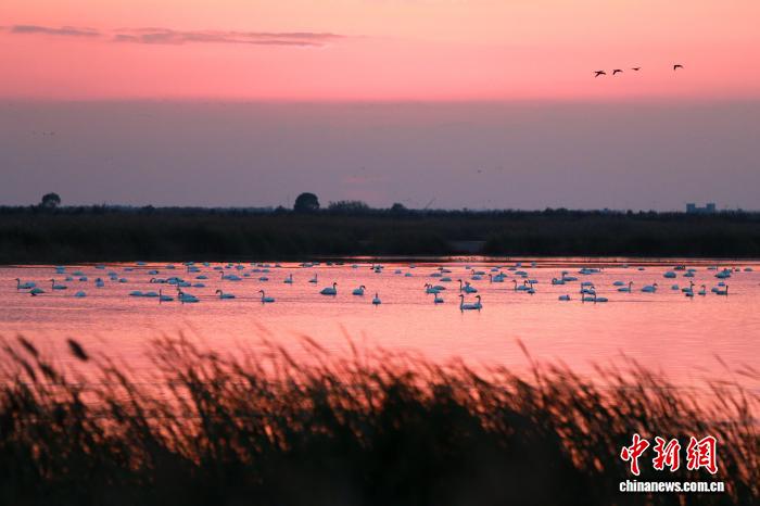 在东营黄河口湿地,一群天鹅在夕阳下栖息觅食。(资料图)梁犇 摄