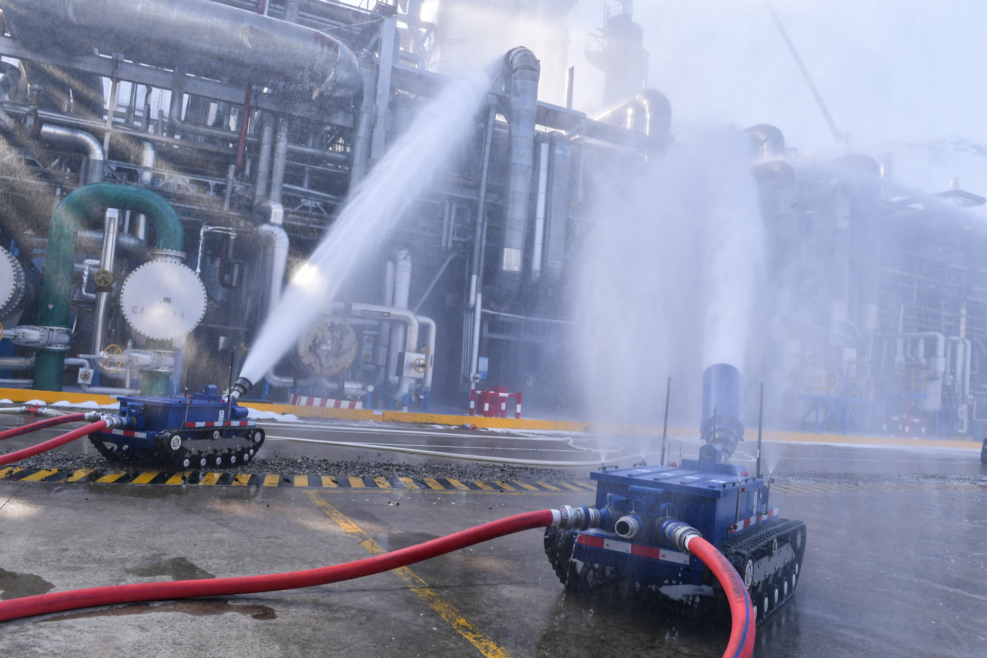 演练灾情设置为急冷油泄漏,引发起火燃烧。受燃烧烘烤导致物料装置管线破裂,引发爆炸起火,形成立体火灾,现场有人员受伤被困。