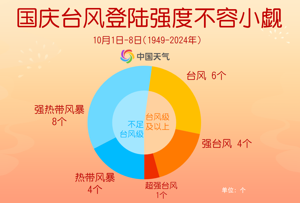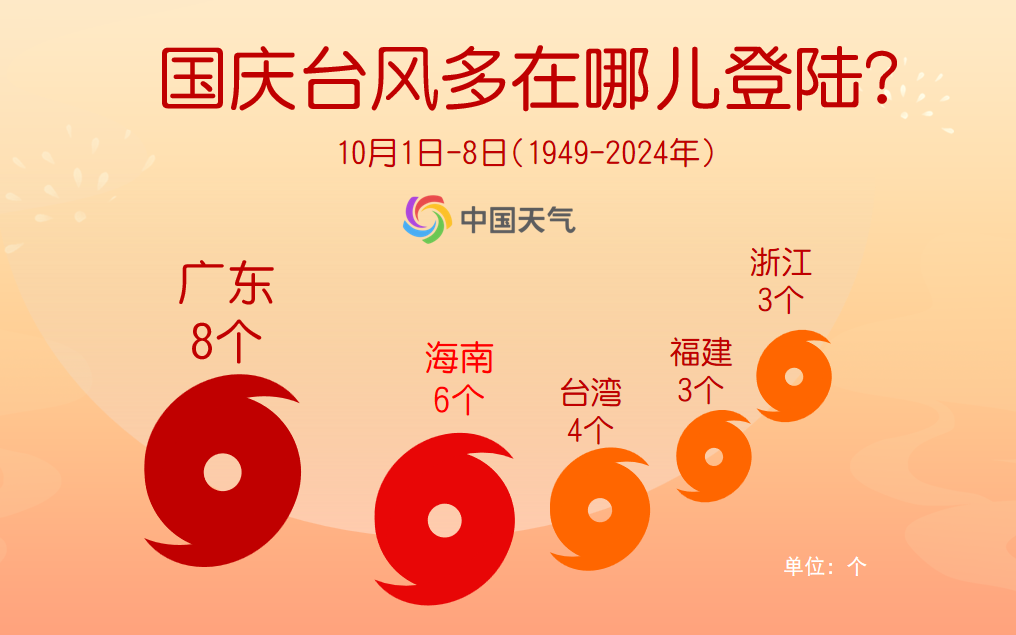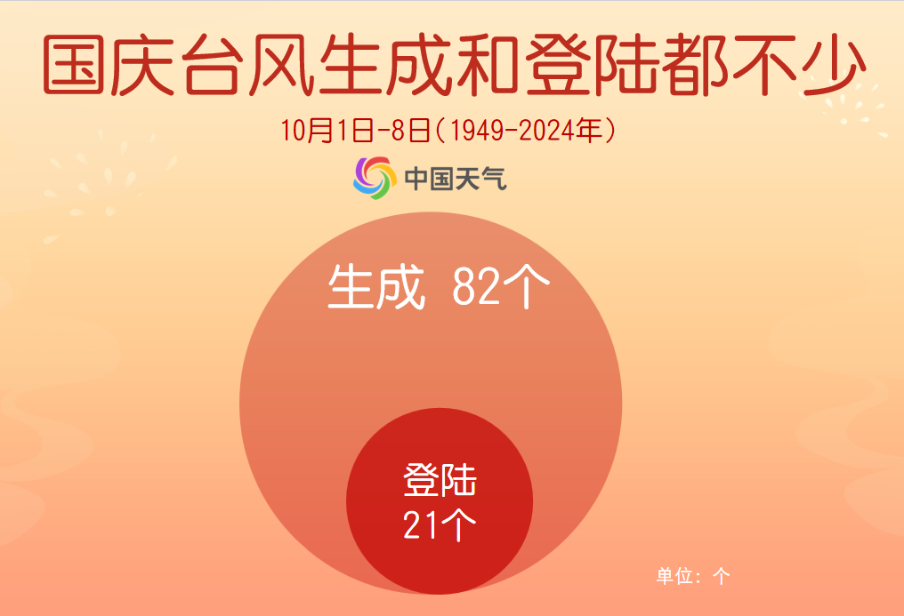 中国天气网盘点1949年至2024年台风大数据发现,历年国庆期间(10月1日至8日),共有82个台风生成,其中登陆我国的台风有21个,平均3至4年就有一个台风在国庆期间登陆。