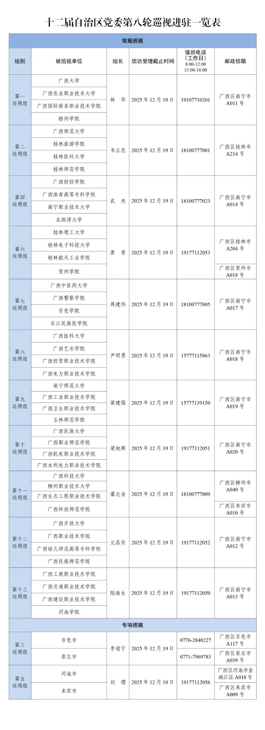 自治区党委巡视组在巡视期间设立专门值班电话和邮政信箱,主要受理反映被巡视党组织领导班子及其成员、下一级党组织领导班子主要负责人和重点岗位人员问题的来信来电来访,重点是关于违反政治纪律、组织纪律、廉洁纪律、群众纪律、工作纪律和生活纪律等方面的举报和反映。巡视组受理信访时间截止到2025年12月19日。