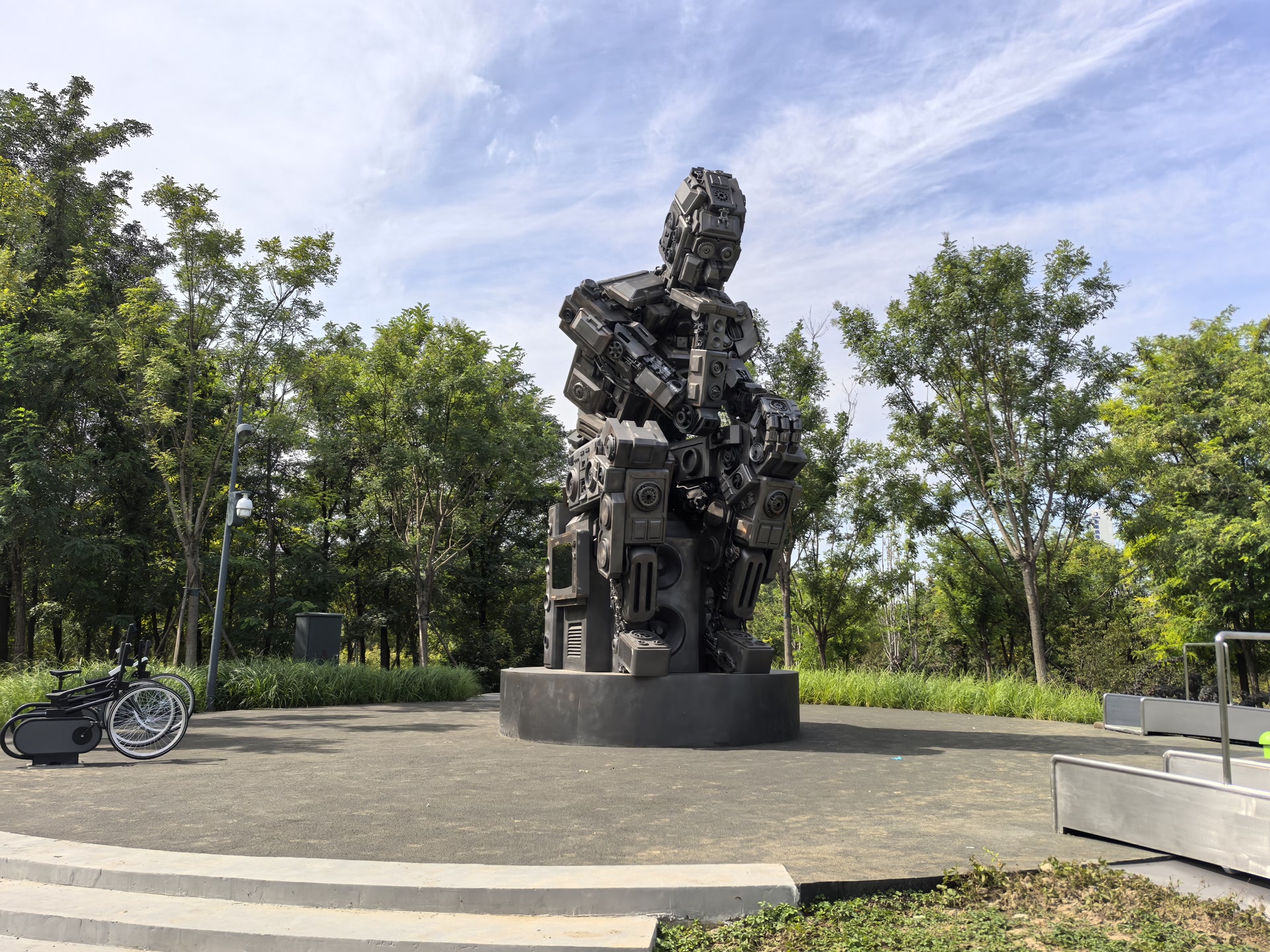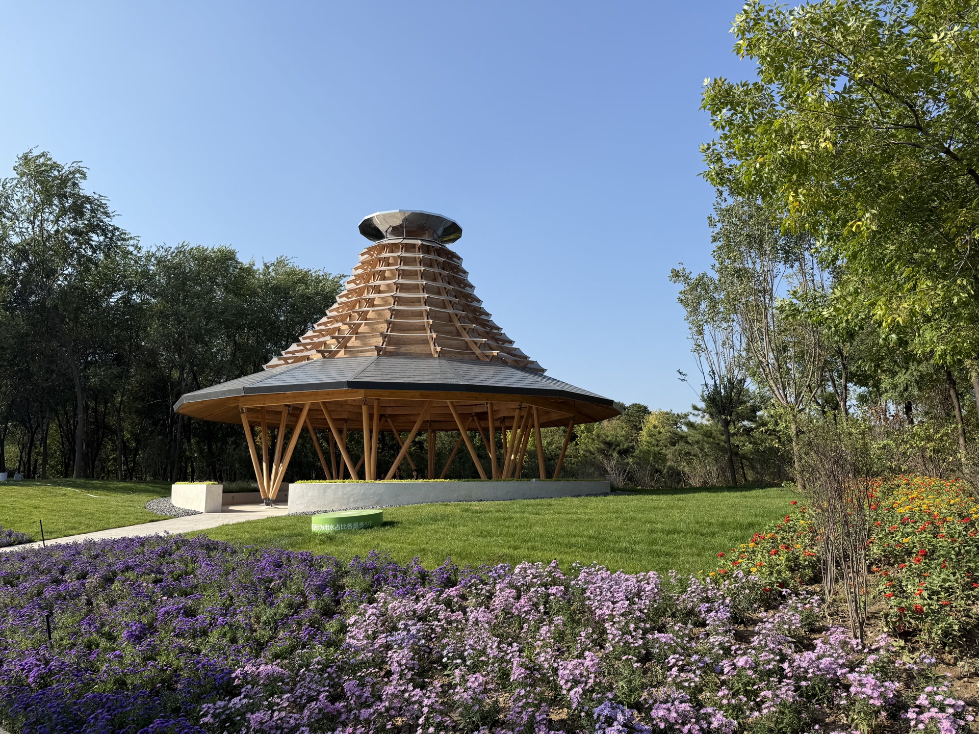 造型别致的“风铃塔”,也藏着公园内低碳环保的秘密。站在现代集成松木构成的风铃塔下,能感受到丝丝凉意,明显低于塔外的温度,这可不是塔内开了空调。黄通介绍,塔身造型利用“烟囱效应”引导空气流动,塔顶的不锈钢反光板让局部空气加热,塔底的凉气通过收缩的塔身自然拔风而上,实现自然通风降温。
