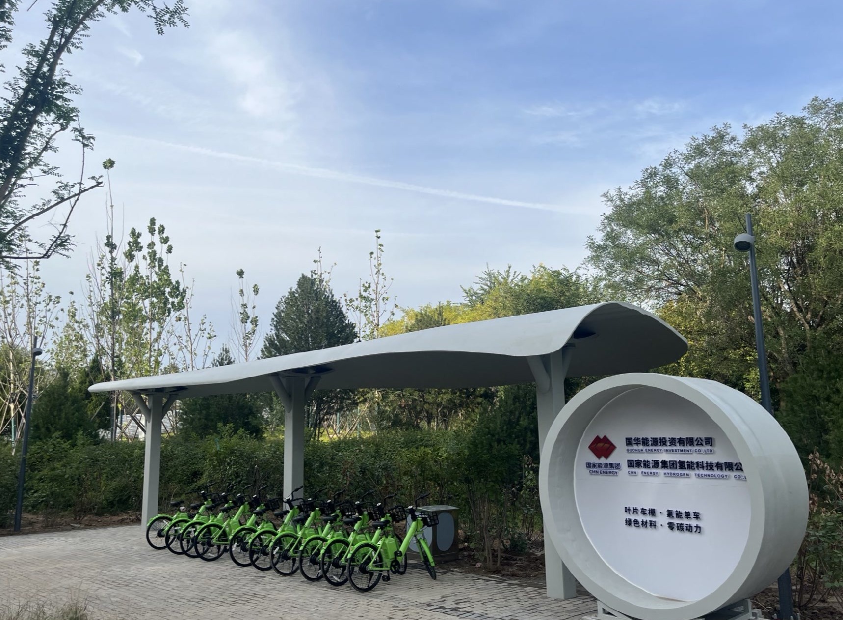 在氢能自行车驿站,一排绿色氢能自行车正等待着过往游人体验。北京温榆河公园昌平段设计师黄通告诉记者,“自行车通过电解水产生清洁氢气,储存在便携氢能棒中,游客骑行时只需更换氢能棒,3秒就能完成加氢,全程无碳排放。” 记者注意到,游客可以扫码骑行,可用园区内获得的碳积分抵扣费用,还有专门的工作人员日常维护。