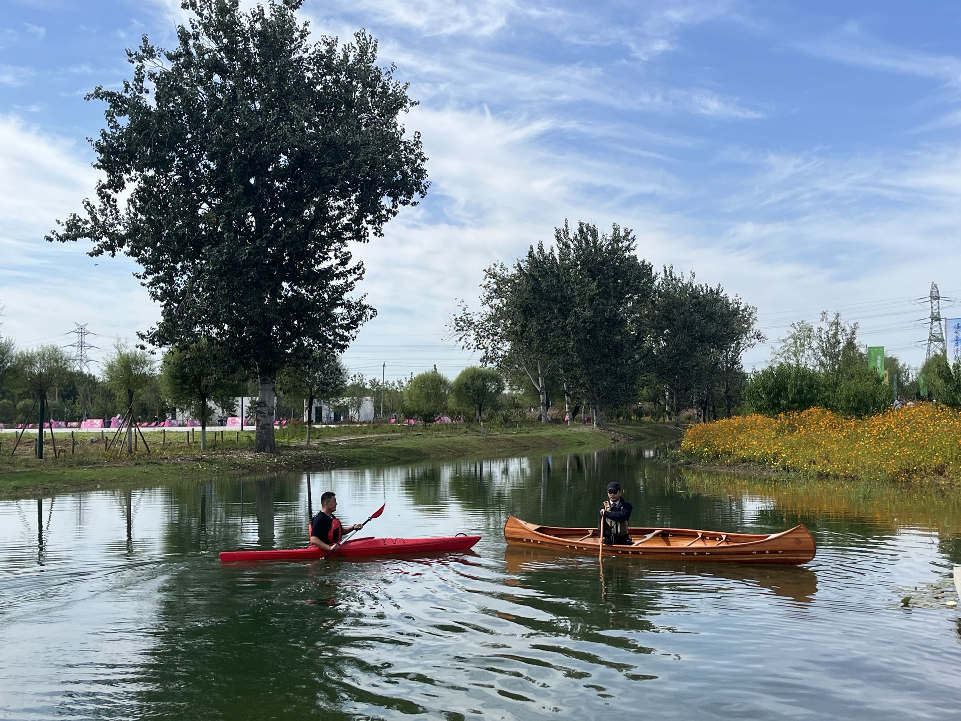 9月29日上午,温榆河公园新建地标形似“鸟巢”的网球中心外,一大片清澈的水域内,人们正悠然划着独木舟、皮划艇。湖岸,波斯菊、秋英正盛,菊花花海犹如黄色地毯铺展开来。人行道边,成片的绿植随风摇曳,高树低花,色彩斑斓,层次分明。行走花间小径间,鸟鸣声不断,好似来到“天然氧吧”。