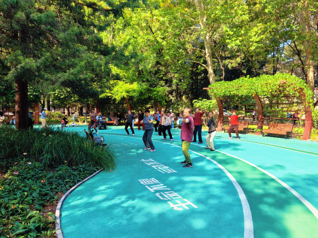 从公园北门步入,不远处的激情广场热闹非凡,老年人在此舒展拳脚练太极。新增的休闲座椅上,街坊四邻围坐唠家常,这里俨然成了邻里交往的温馨“会客厅”。