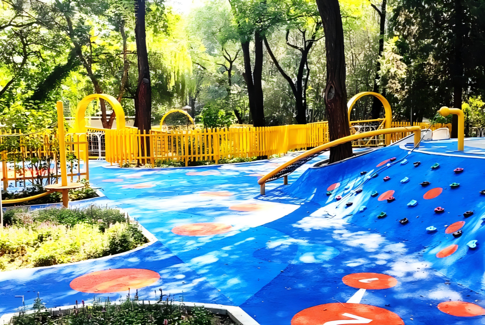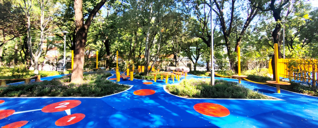 公园在改造过程中,充分考虑青少年亲近大自然的需求,增设了森林探索区和自然趣径区。森林探索区巧妙利用原有坡地,添置了自然木质游戏设施。地面铺设的红蓝两色软质材料,为孩子们的安全保驾护航。自然趣径区则藏着“小惊喜”,公园结合地形打造了雨水花园与森林课堂,随处可见的科普牌,为青少年提供了沉浸式自然科普场所。