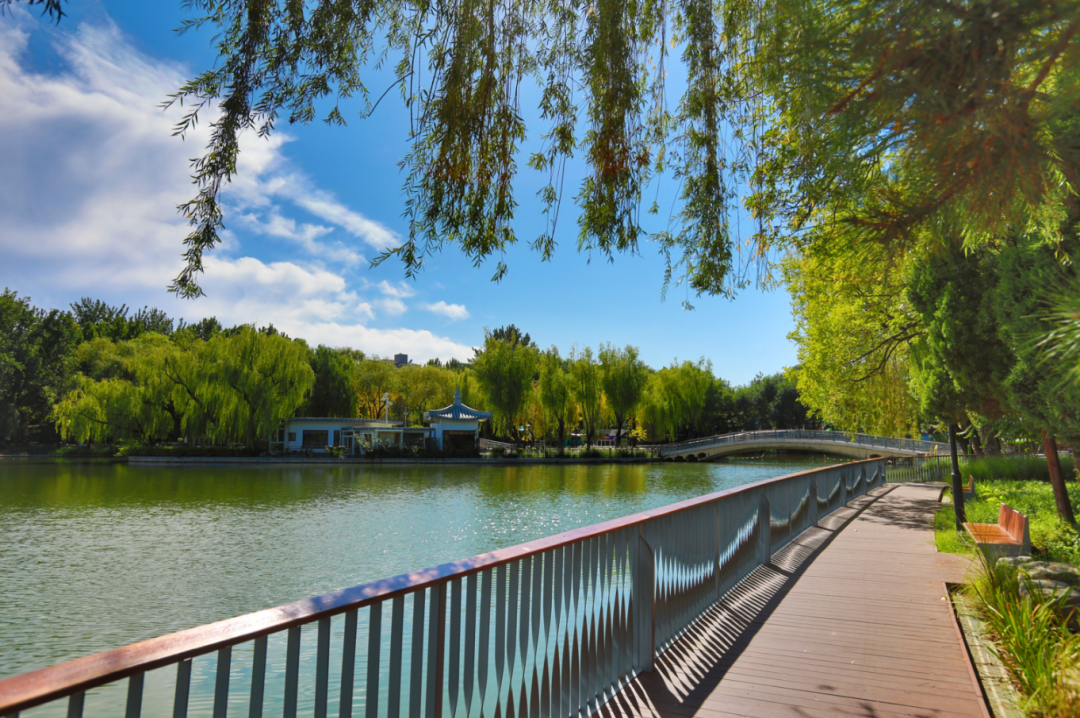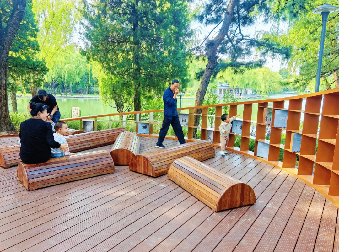 改造后,公园南北两岸增设了亲水平台和滨水栈道。坐在南岸亲水平台的圆凳上,湖光美景可尽收眼底。67岁的周女士笑着说:“这个季节,湖边的柳树还绿着,湖风一吹特别凉快,惬意又舒服。”北岸的亲水平台上,聚集了不少前来赏景的居民,滨水栈道旁也有不少市民前来拍照打卡。