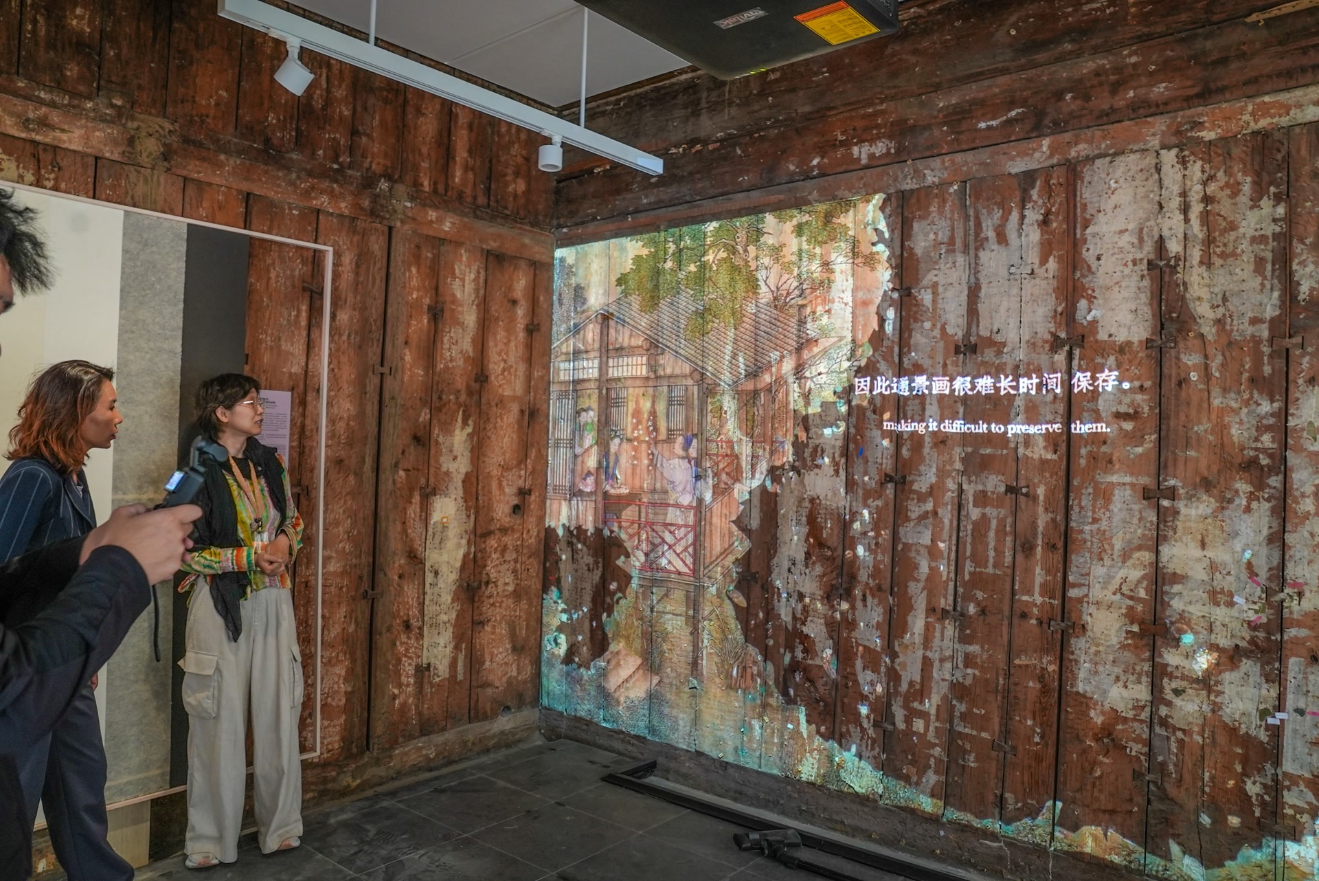 档案记载,这曾有过满墙通景画,但只遗存零星碎纸,面积不足画幅1%。通过显微分析,工作人员努力辨出画面是点点树叶,并以此为据,利用光影,在墙壁上重现通景画的制作过程。
