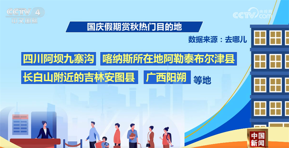 国庆假期赏秋热门目的地包括四川阿坝九寨沟、喀纳斯所在地阿勒泰布尔津县、长白山附近的吉林安图县、广西阳朔等地。