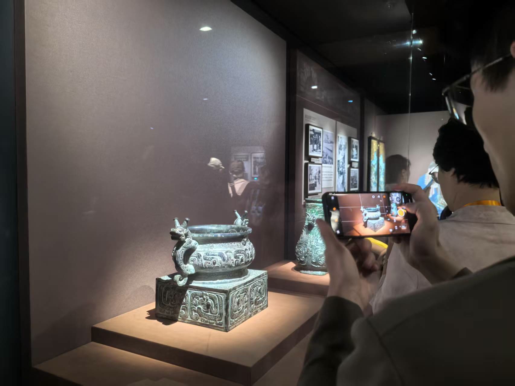 展厅二层,展览分“古物重光文脉赓续”“薪火相传 生生不息”两部分,回顾了抗战时期故宫提选珍贵文物,先后赴英国伦敦、苏联莫斯科等地参加中国艺术国际展览会,并在重庆、贵阳、成都等地举办书画展览以答谢西南地区各界人士对故宫文物典守珍护的往事,并在南迁文物和130余万件留平(北京)文物中选出代表,展现中国文化的整体性和两岸故宫藏品不可分割的关联性。