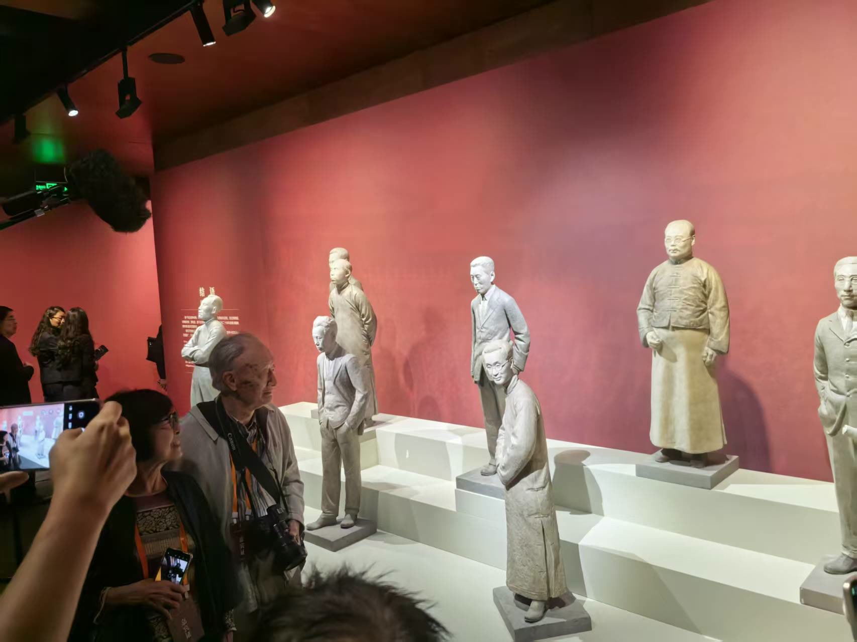 展览结尾,是一组名为“功侔鲁壁”的南迁人物现代雕塑。满头白发的庄灵被摄影记者邀请,站在父亲庄严的雕塑旁合影。他说:“从文物、文献,到看到这群‘人’,非常感动。”