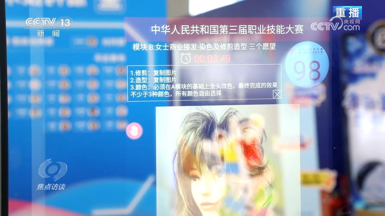 美发赛项解说员岳静茹:“赛场升级,智慧屏的一些赛题展示、一些要求,传统比赛意义上,很多赛题以及图片可能是纸质的,可能会出现打印偏色以及阅读的时候关键信息遗漏。但是一直显示在屏幕上,有职业场景的保留,还有比赛功能性的保留,选手可能会遇到问题,举手系统连接到我们的后台,这样记录就会比人工记录更加客观和科学。”