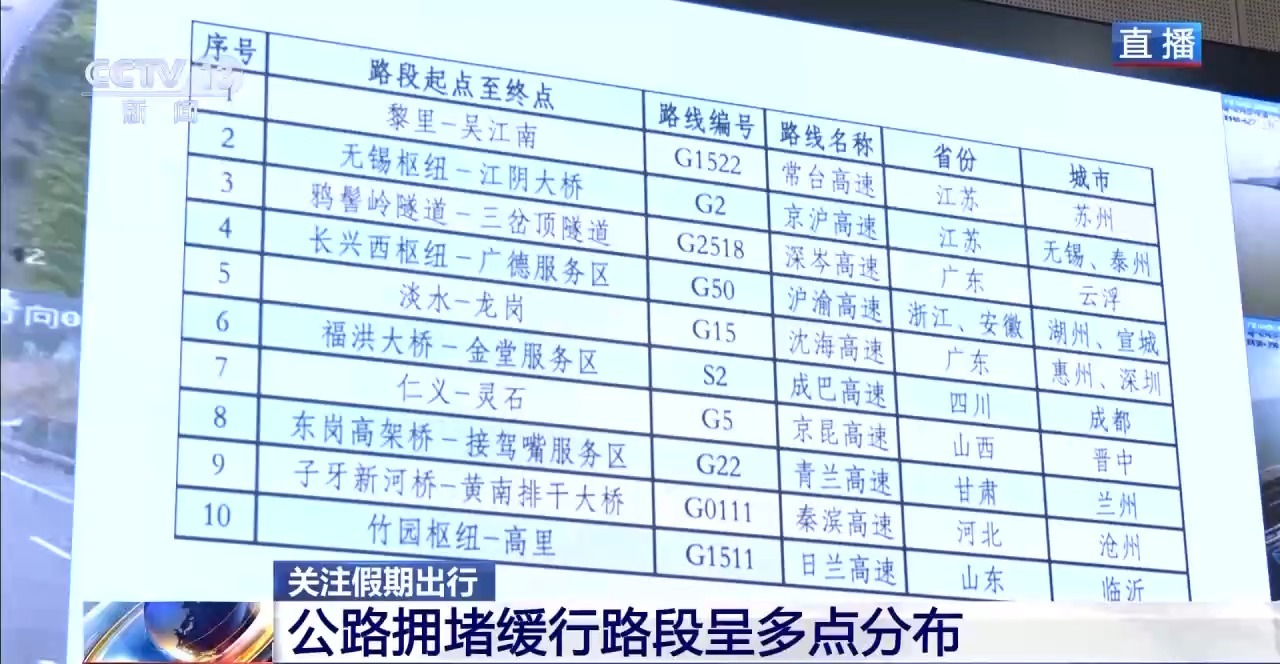 因为今年假期一共8天,因此公路中长距离的出行增长比较明显。出行总量大、热点多,公路拥堵缓行路段呈现多点分布的特征。
