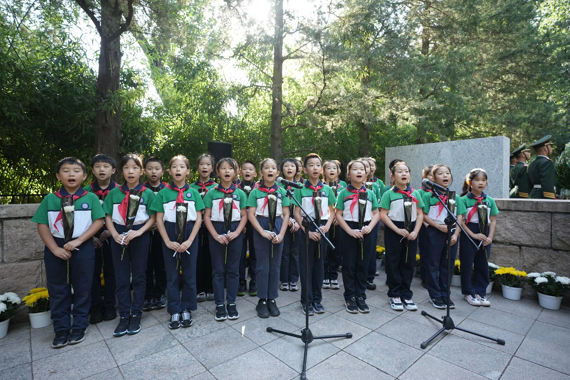 仪式中,20余名少先队员代表手持鲜花,高唱《我们是共产主义接班人》,并致以少年先锋队队礼。高亢嘹亮的歌声,饱含新时代少年对英烈的缅怀之情,也传递出继承光荣传统,传承英烈精神,坚定当好接班人的远大志向。